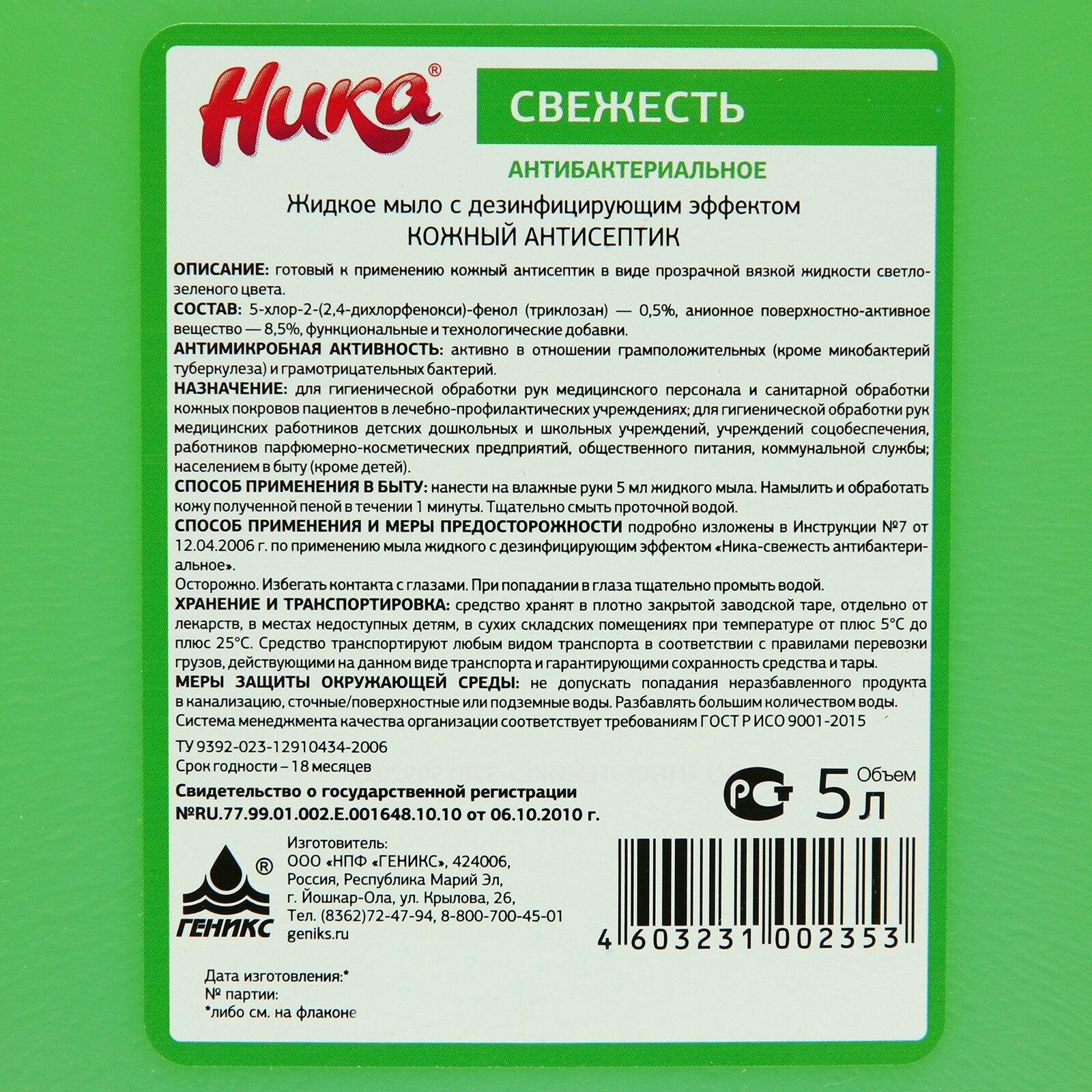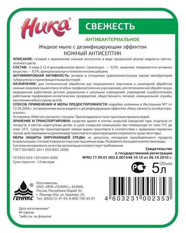 Мыло дезинфицирующее НИКА 5 л, НИКА "Свежесть", антибактериальное