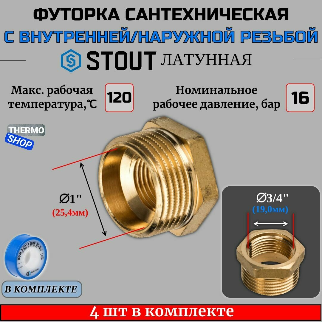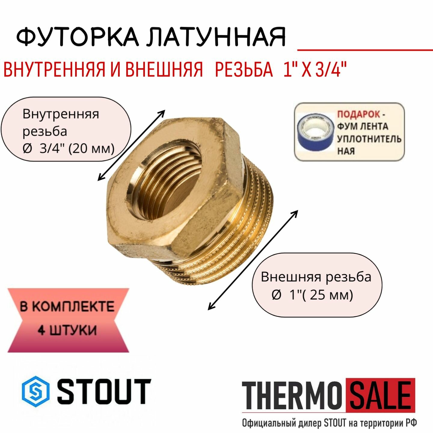Купить Футорка латунная 1"X3/4" 4 шт сантехническая для труб и Фум лента