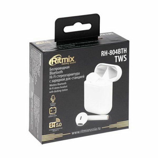 Гарнитура RITMIX RH-804BTH TWS White, Bluetooth 5.0, динамик: 10 мм, 32 Ом, 40 мАч (наушники), кейс 300 мАч, до 4 ч на одном заряде, порт для заряда кейса USD Type-C, пластик (1/80)