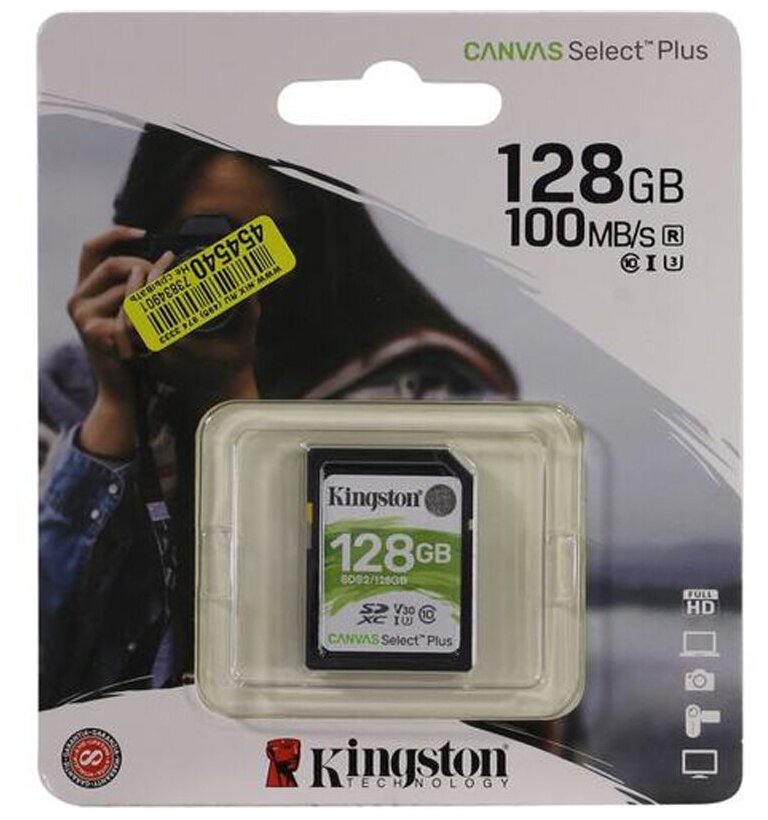 Карта памяти SDXC UHS-I U3 Kingston Canvas Select Plus 128 ГБ, 100 МБ/с, Class 10, SDS2/128GB, 1 шт., без адаптера