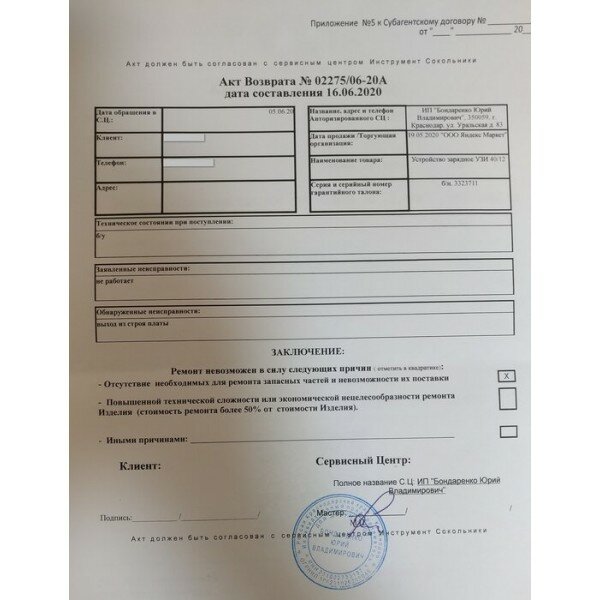 | Отзыв: | Заказывал на Беру в магазине "Инструмторг". Первое устройство подключил, как написано в инструкции, включил в розетку - диод на корпусе не горит. Проверил тестером - ток на зажимы не идёт. Позвонил в магазин. Предложили отнести в сервис-центр по гарантии. Заключение СЦ на фото. "Инструмторг" прислал курьера, который забрал у меня неисправное устройство на обмен. Взял такую же модель, уповая на то, что мне просто попался брак. Сейчас получил новое устройство - симптомы те же: диод не горит, заряд не идёт. Буду делать возврат денег и искать другую модель. |