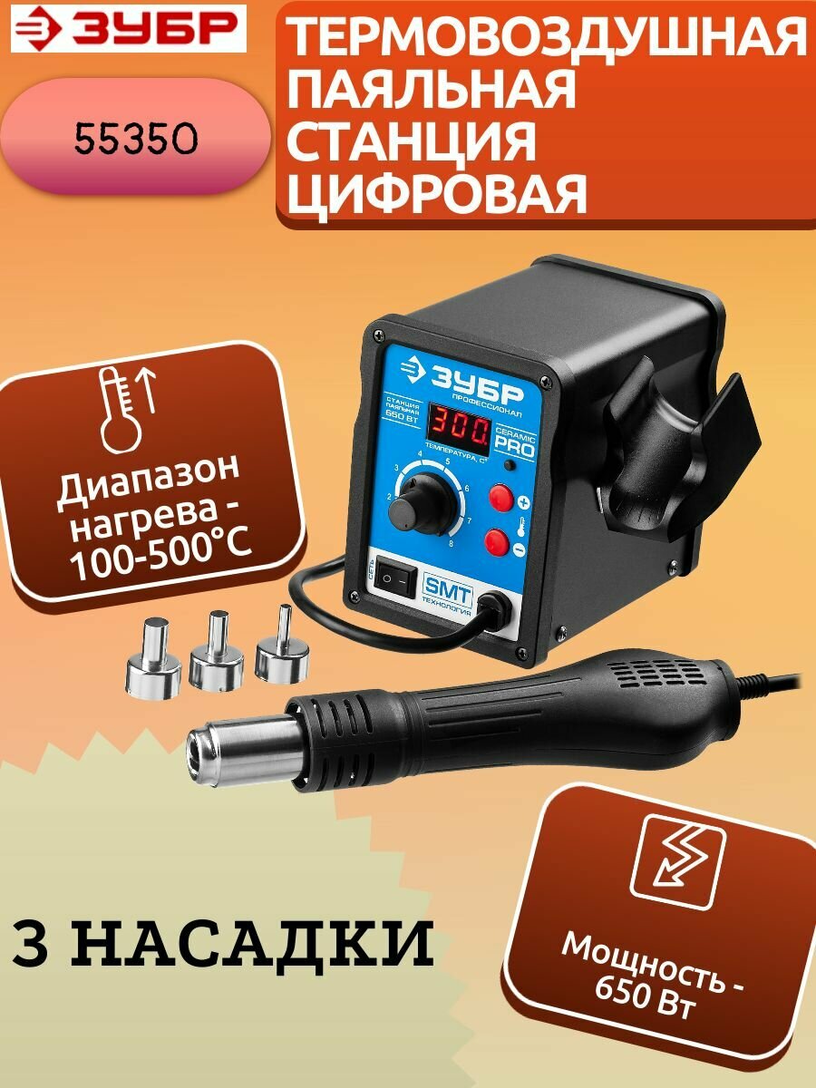 ЗУБР ПСТ-650 термовоздушная паяльная станция цифровая, 100-500°C, шаг 1°C, 120 л/мин, 650 Вт, 3 насадки.