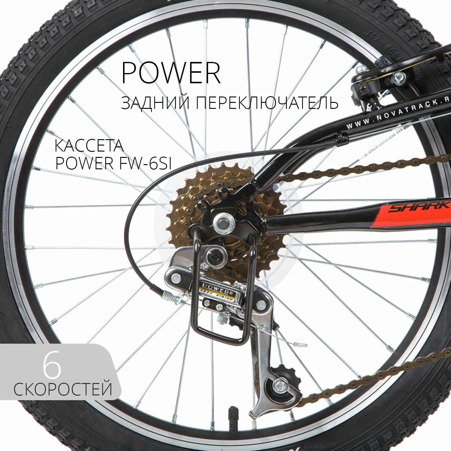 Велосипед NOVATRACK 20" SHARK белый, сталь, 6-скор, Microshift/Power, V-brake 20SS6V.SHARK.WT20