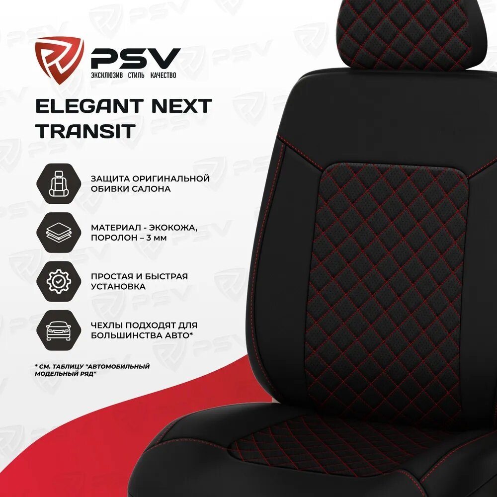 Купить Чехлы в машину для коммерческого транспорта PSV Elegant Next TRANSIT (Черный/Ромб красный/отстрочка красная), ромб + экокожа