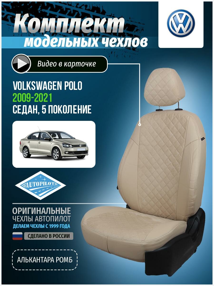 Модельные авточехлы АВТОПИЛОТ для Volkswagen Polo (седан, задний диван раздельный, 2009-2020гг) алькантара ромб, бежевые