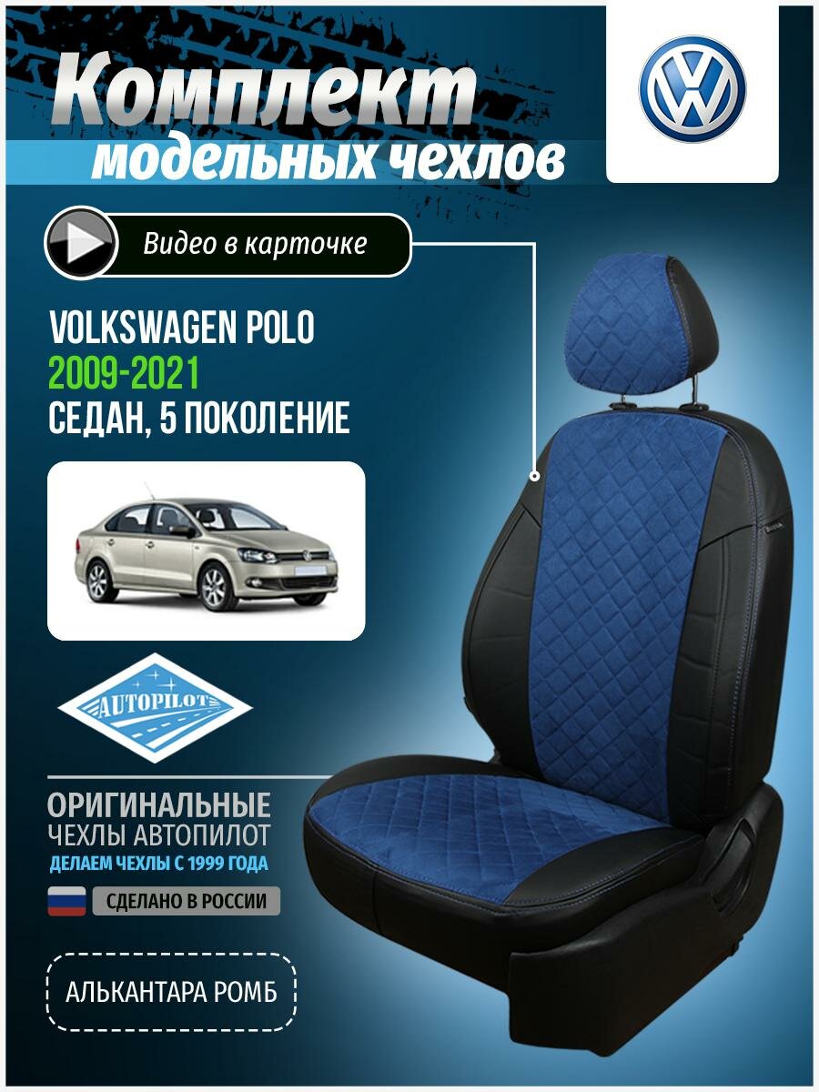 Модельные авточехлы АВТОПИЛОТ для Volkswagen Polo (седан, задний диван раздельный, 2009-2020гг) алькантара ромб, черно-синие