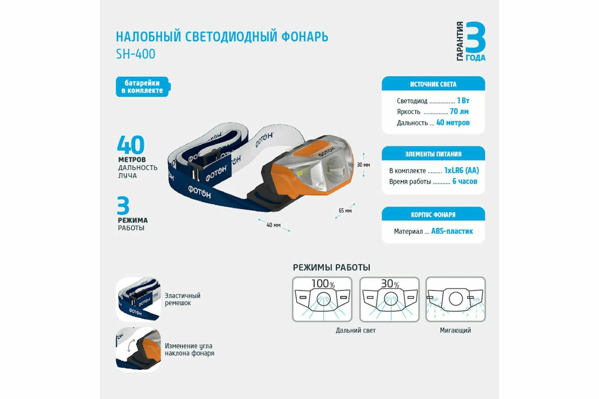 Фонарь налобный светодиодный "фотон" SH-400 (1хLR6 в комплекте)