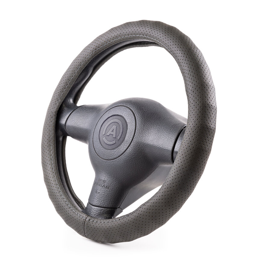 Оплетка руля AUTOPROFI AP-1912 D.GY (M) с увеличенным обхватом 9 см., композитная экокожа перфорированная, ребристая основа. тёмн.серый, разм. М,
