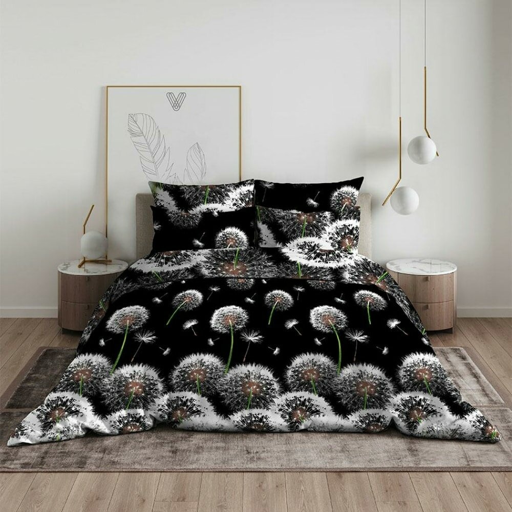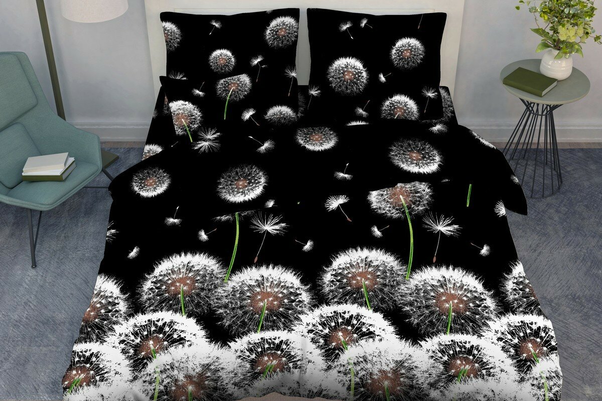 Постельное белье Василиса Белые одуванчики, бязь, евростандарт, черный/белый