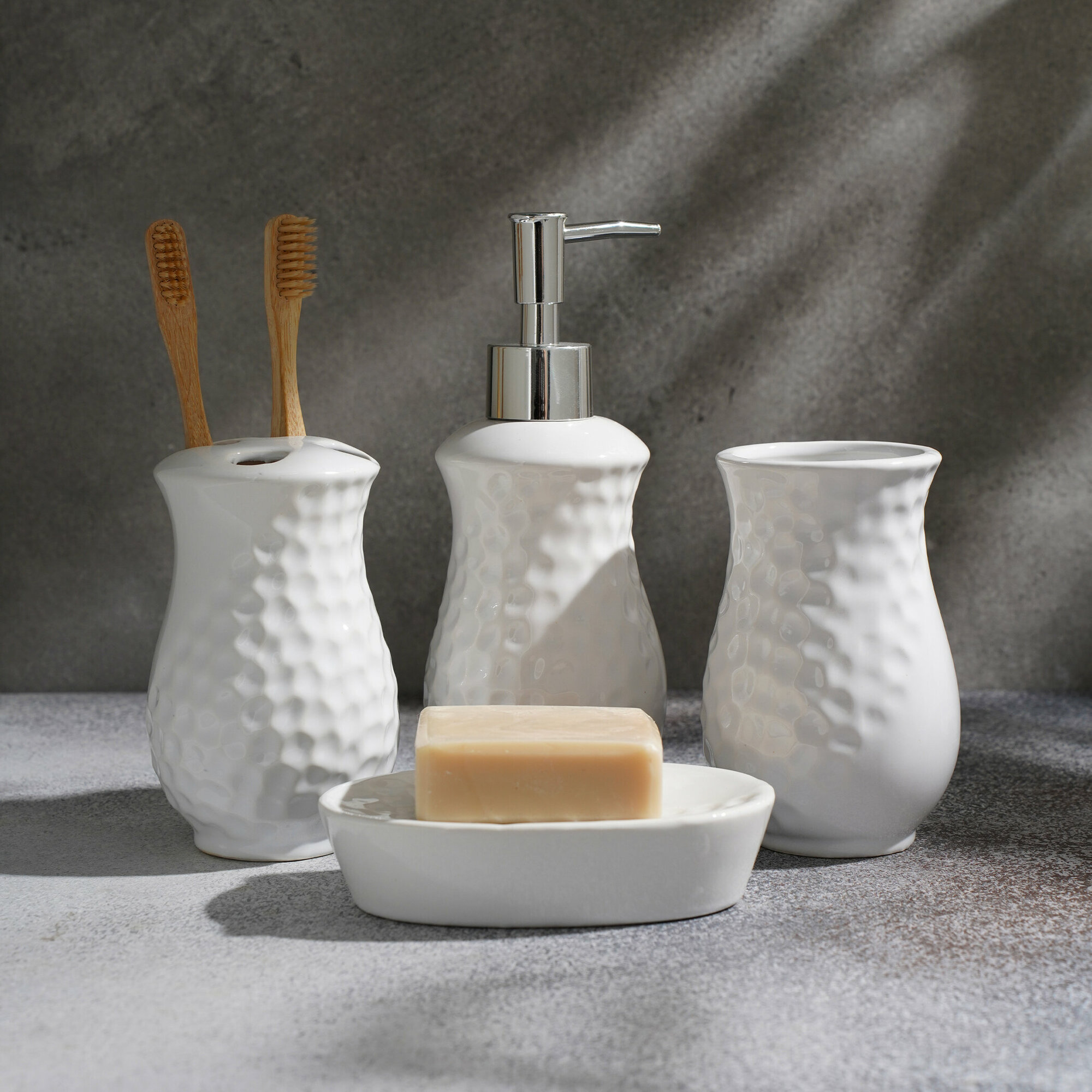 Купить Аксессуары для ванной Доляна «Рельеф», набор 4 предмета, дозатор, мыльница, стаканы, цвет белый