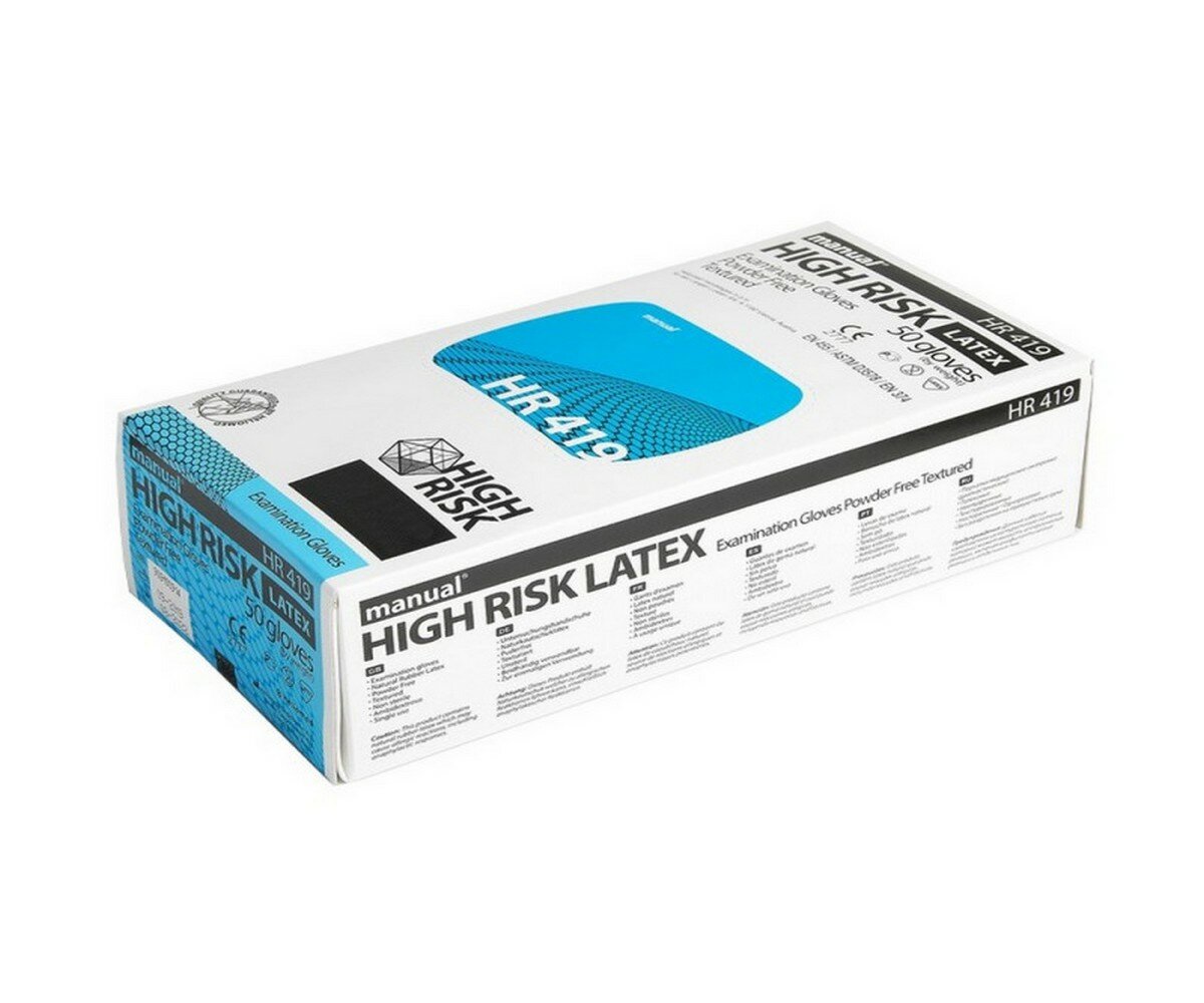 Перчатки латексные медицинские Manual High Risk HR419, M, 50шт., неопудренные, особо прочные, картонная коробка ( Артикул 310690 )
