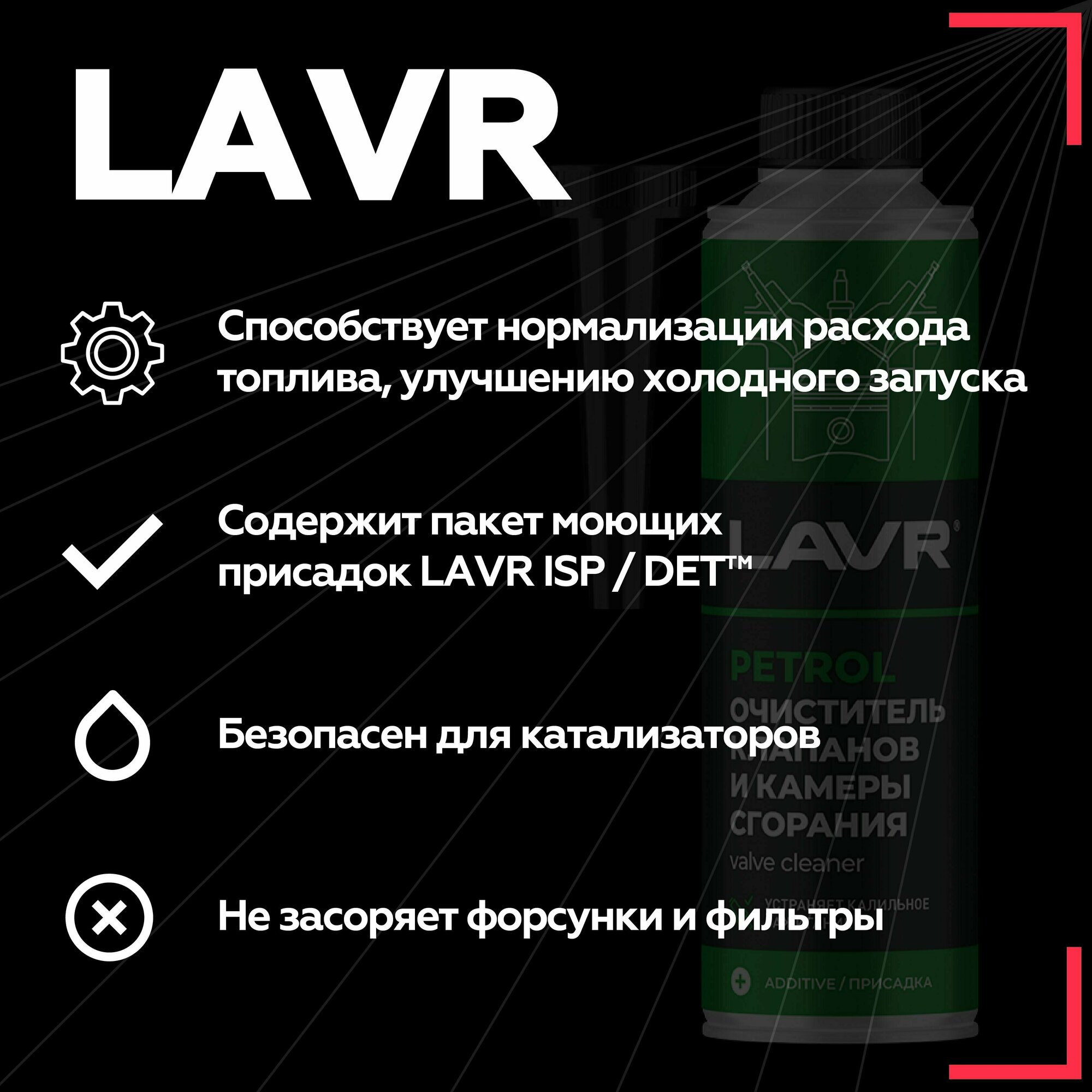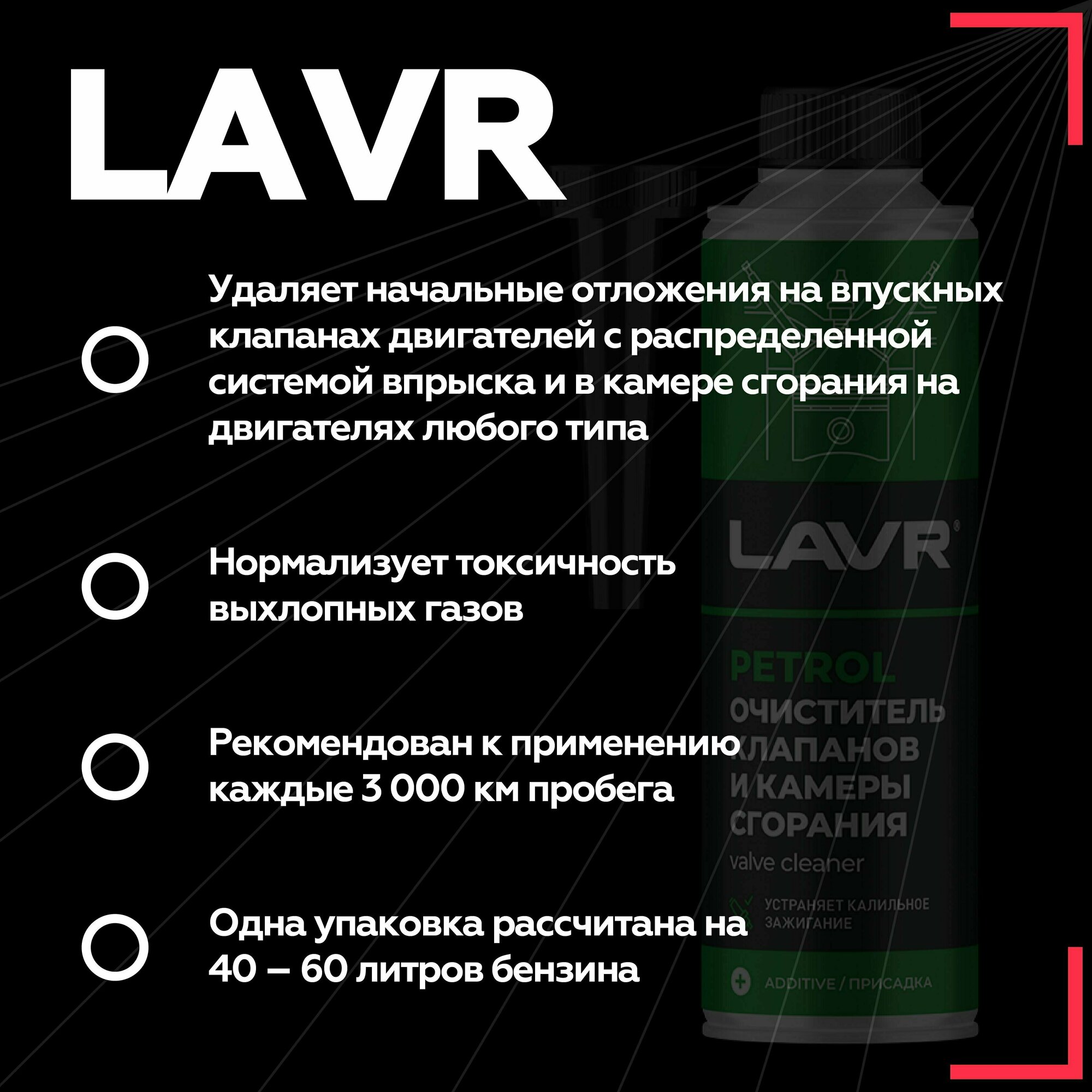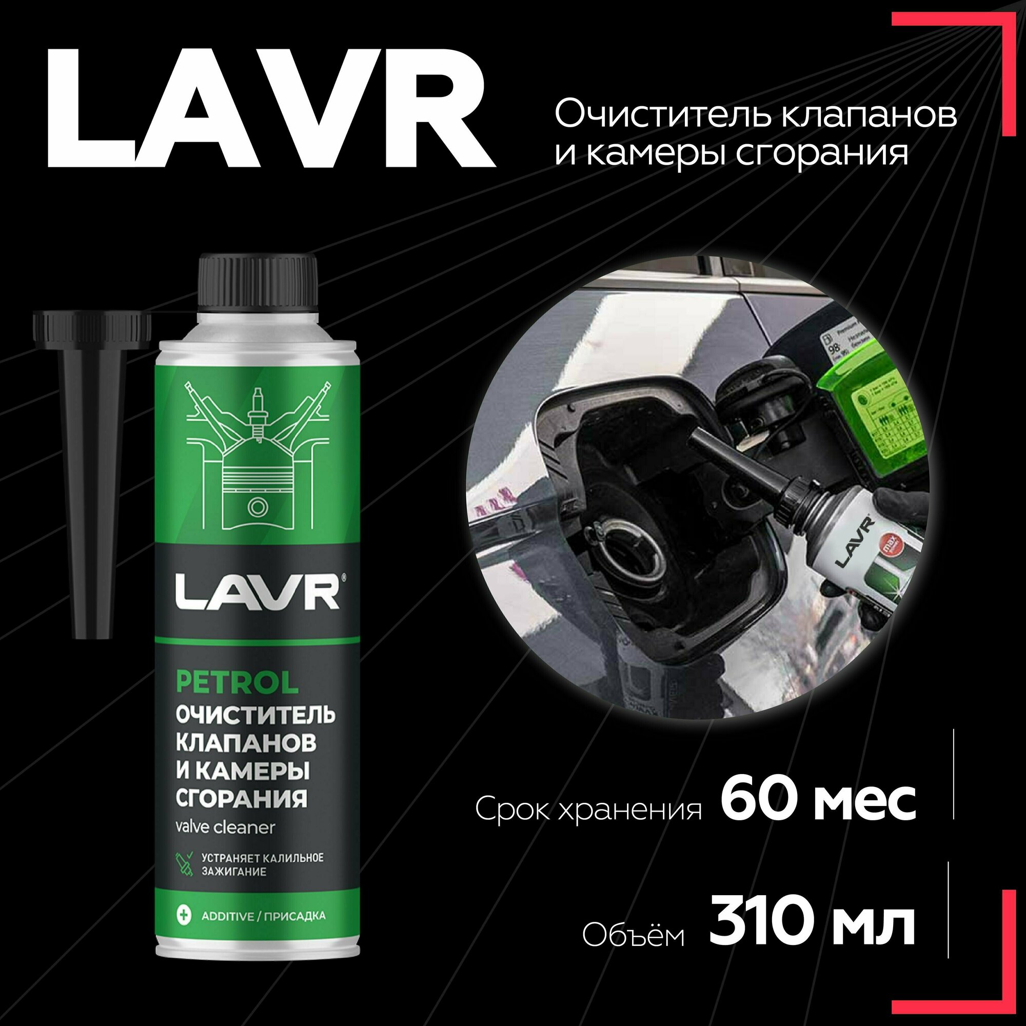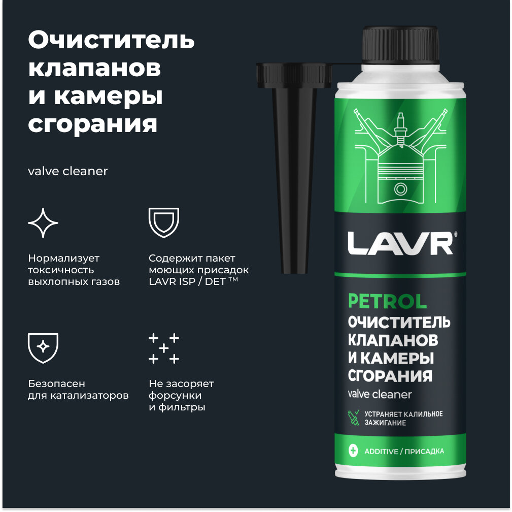 LAVR / ln2134 / Очиститель клапанов и камеры сгорания присадка в бензин, 310 мл