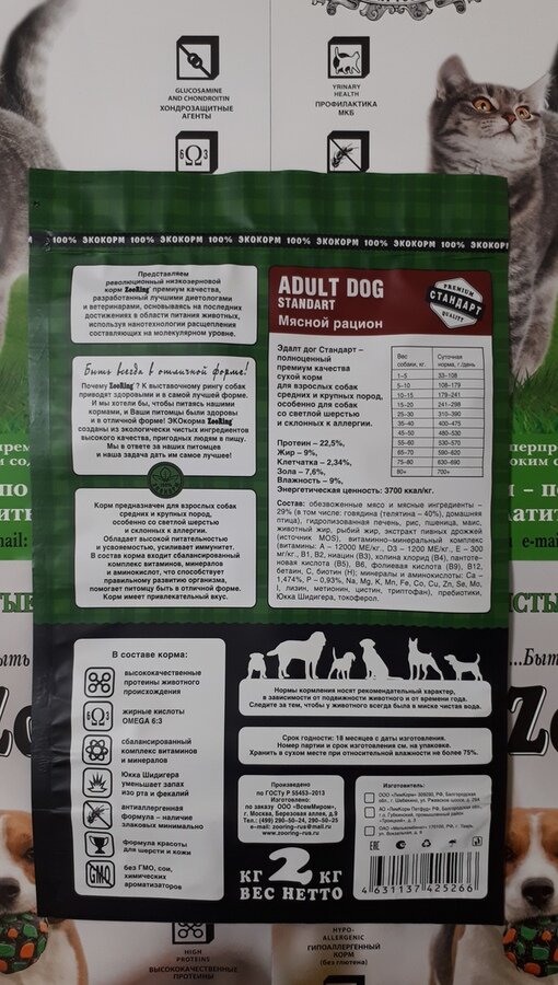 Сухой корм для собак ZOORING ADULT DOG STANDART мясной рацион 2 кг корм для молодых и взрослых собак всех пород, которым требуется пониженное содержание протеина и жира