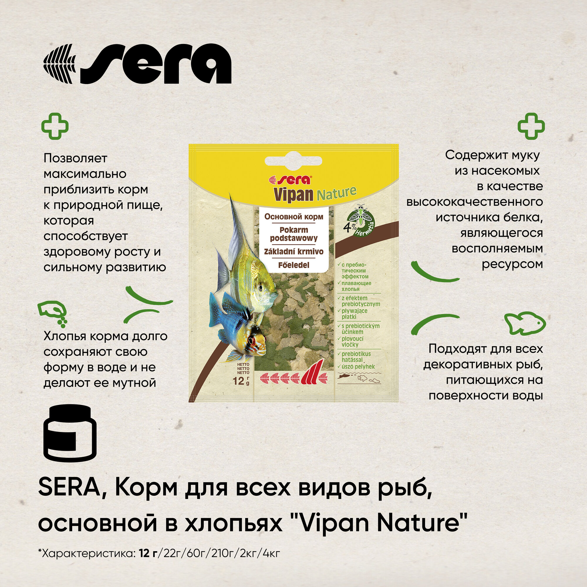 Купить SERA, Корм для всех видов рыб, основной в хлопьях "Vipan Nature", 1 пакетик, 12 г, S0132
