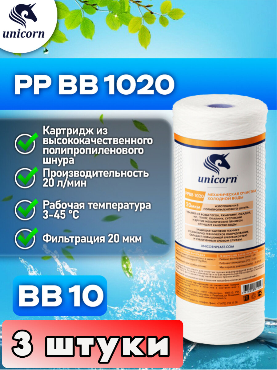 Картридж для фильтра воды механическая очистка из полипропиленового шнура для холодной воды типоразмер 10"ВВ (Big Blue) фильтрация 10 микрон Unicorn PPBB1010 3 штуки