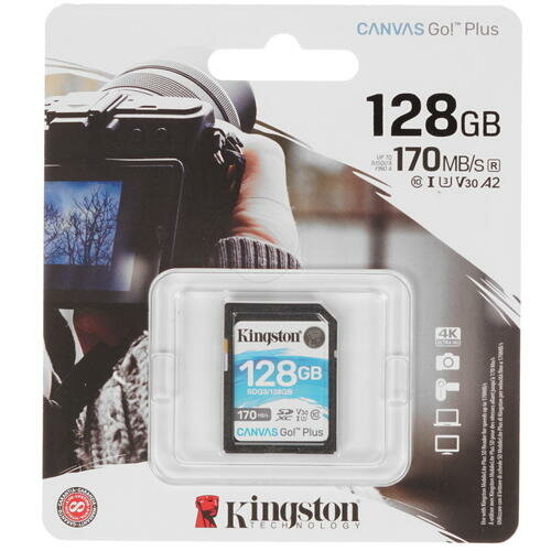 Карта памяти SDXC UHS-I U3 Kingston Canvas Go! Plus 128 ГБ, 170 МБ/с, Class 10, SDG3/128GB, 1 шт., без адаптера