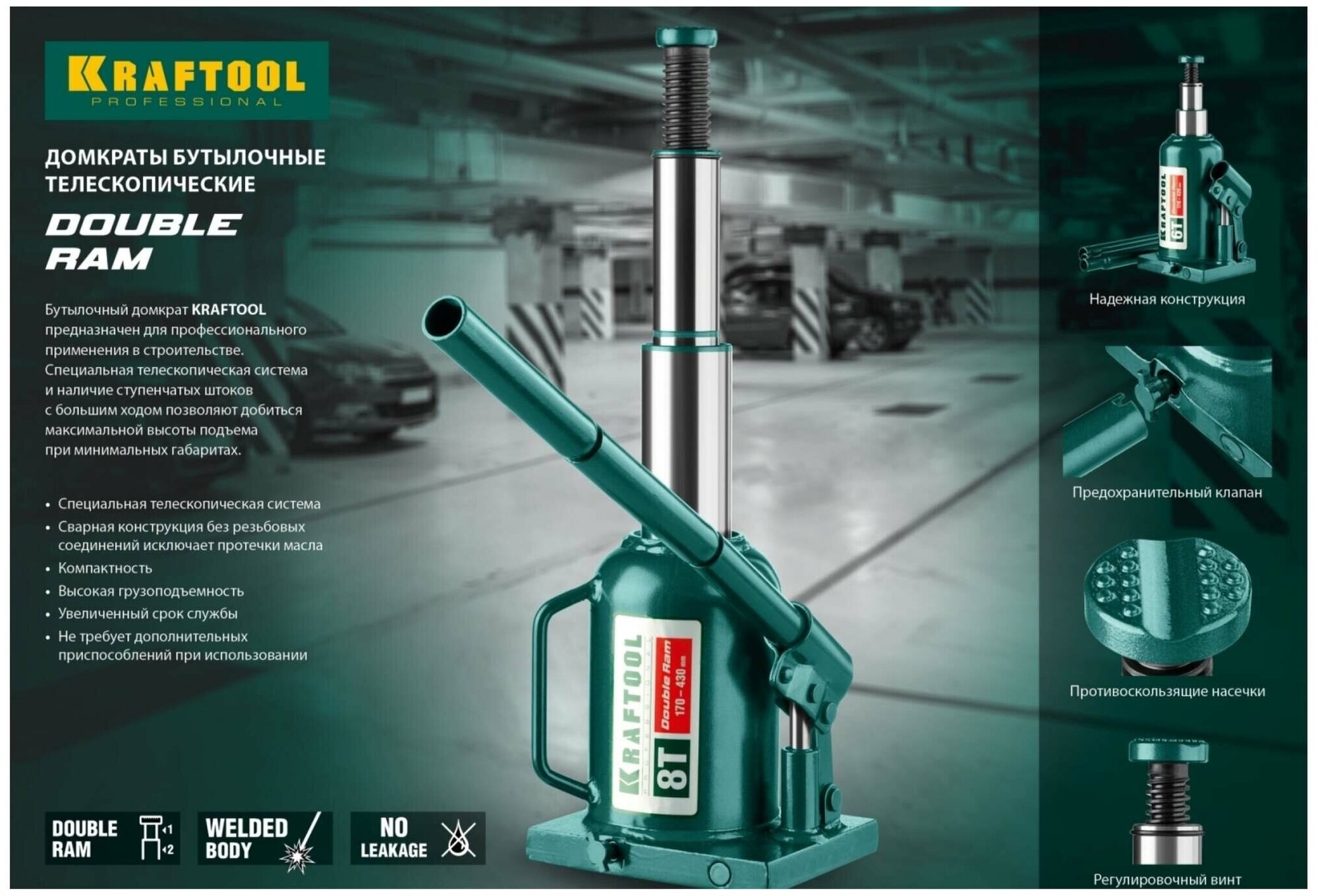 KRAFTOOL DOUBLE RAM 4т 170-420мм домкрат двухштоковый бутылочный с увеличенным подъемом, KRAFT BODY