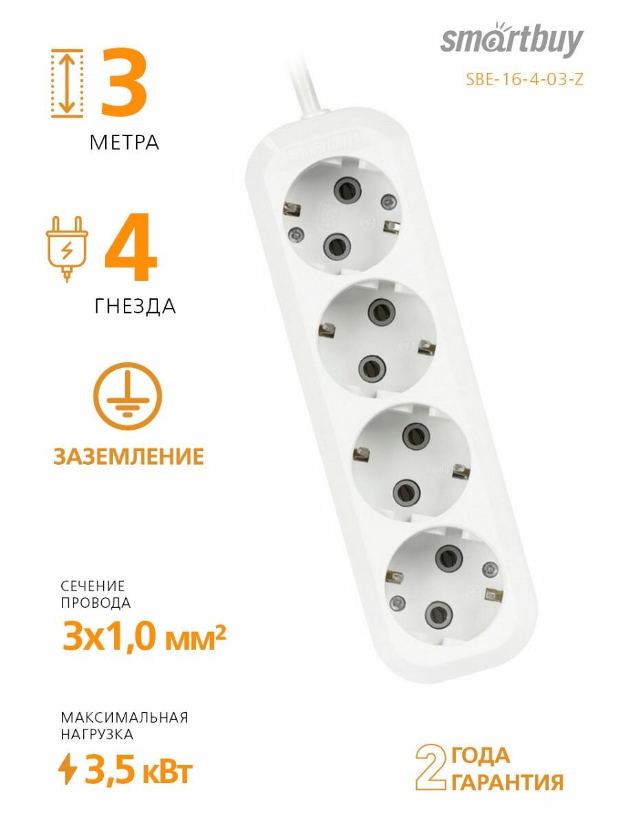 Купить Удлинитель SMARTBUY SBE-16-4-03-Z 16А/3.5кВт, ПВС 3х1.0, 4 розетки, 3,0м, белый