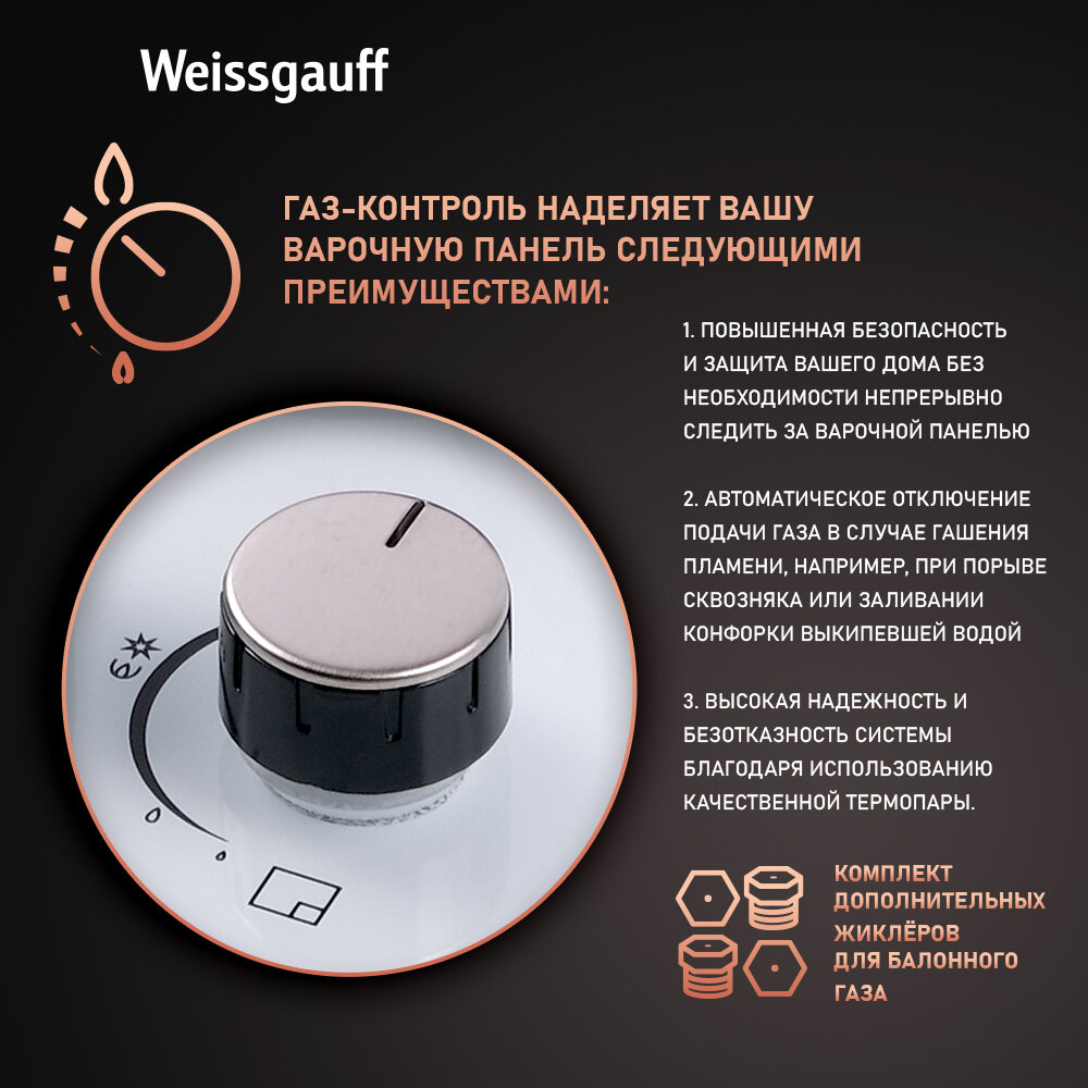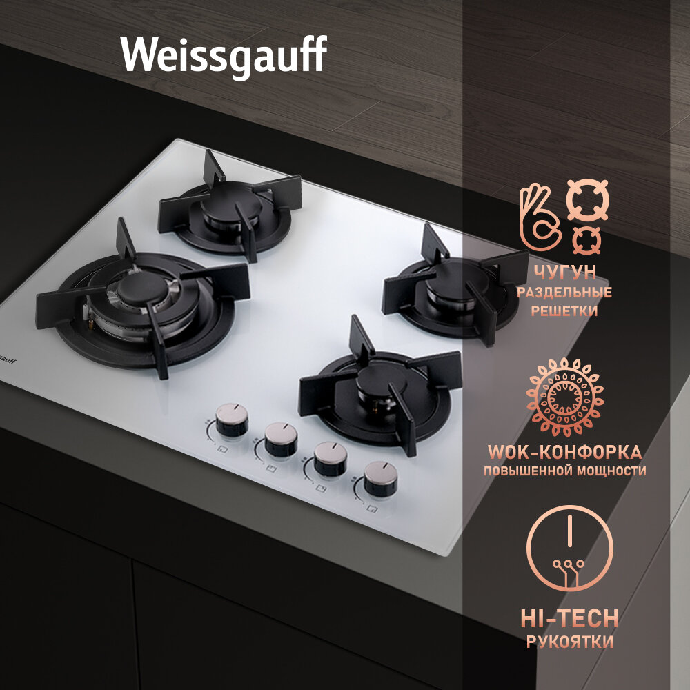 Варочная панель Weissgauff HGG 640 WGW WOK-конфорка, 3 года гарантии, автоматический электроподжиг, Рукоятки Hi-Tech, газ-контроль