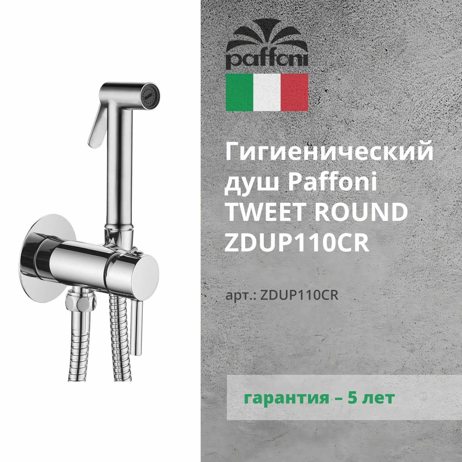 Гигиенический набор Paffoni TWEET ROUND: душ и держатель из металла, шланг металл 1200 мм, co смесителем, хром. ZDUP110CR