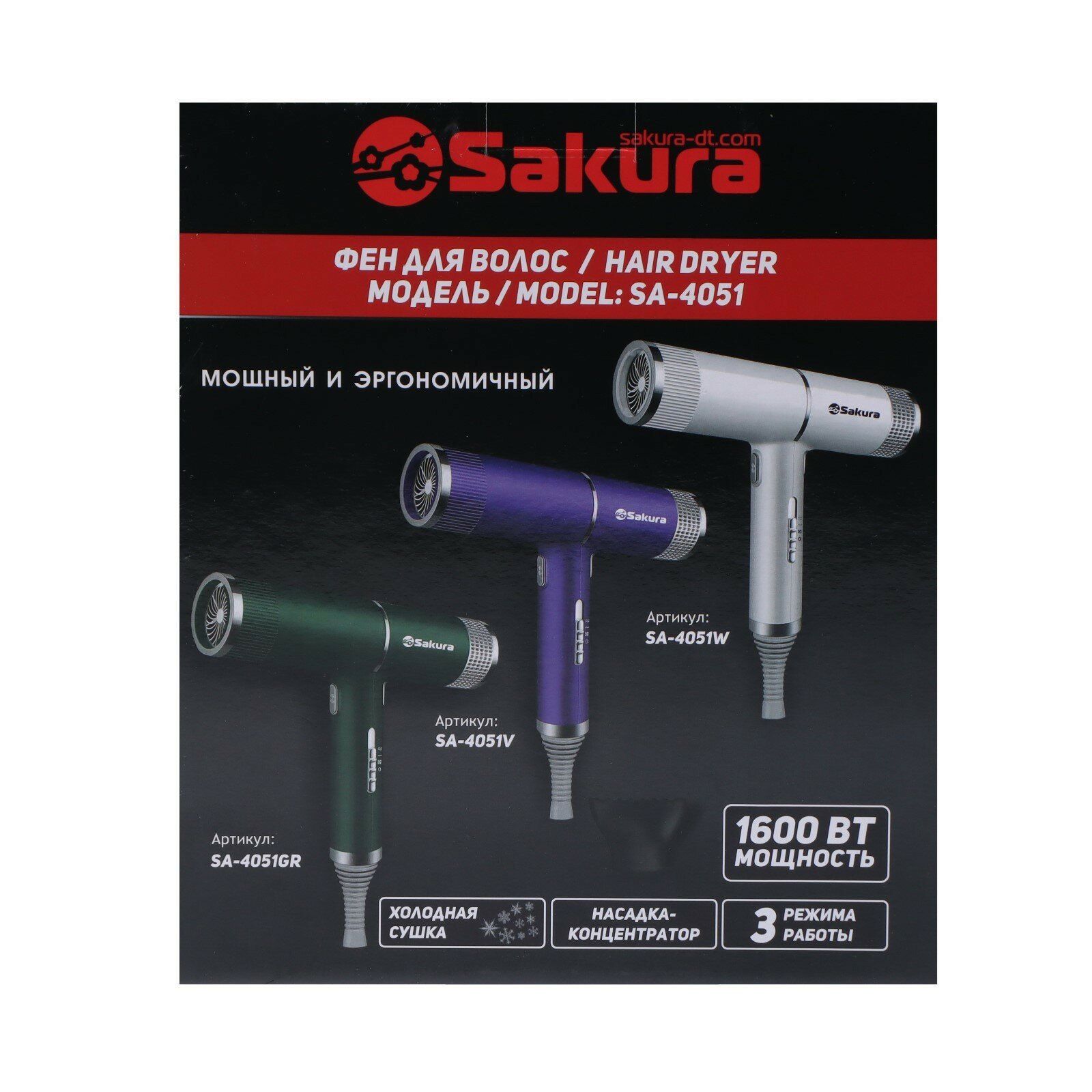 SAKURA Фен Sakura SA-4051GR, 1600 Вт, 3 скорости, 3 темп. режима, концентратор, шнур 1.8 м, зелёный