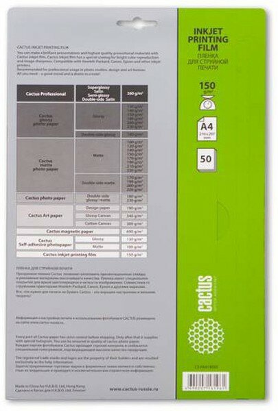 Ниже Вы можете прочитать отзывы на Пленка Cactus A4, 150г/м2, 50л., прозрачная для струйной печати CS-FA415050, ознакомится с подробными характеристиками, посмотреть интересные обзоры и фотографии на Пленка Cactus A4, 150г/м2, 50л., прозрачная для струйной печати CS-FA415050.