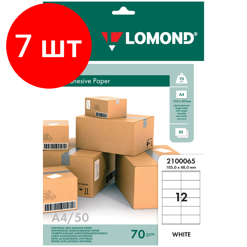 Купить Комплект 7 шт, Бумага самоклеящаяся А4 50л. Lomond, белая, 12 фр. (105*48), 70г/м2