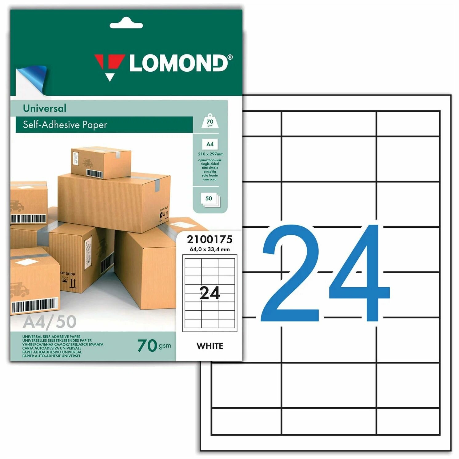 Самоклеящаяся бумага LOMOND универсальная для этикеток, A4, 24 делен. (64 x 33,4 мм), 70 г/м2, 50 л