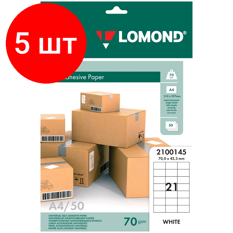 Купить Комплект 5 шт, Бумага самоклеящаяся А4 50л. Lomond, белая, 21 фр. (70*42.3), 70г/м2