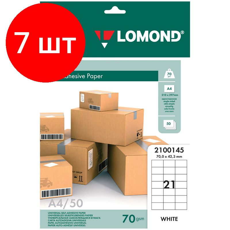 Купить Комплект 7 шт, Бумага самоклеящаяся А4 50л. Lomond, белая, 21 фр. (70*42.3), 70г/м2