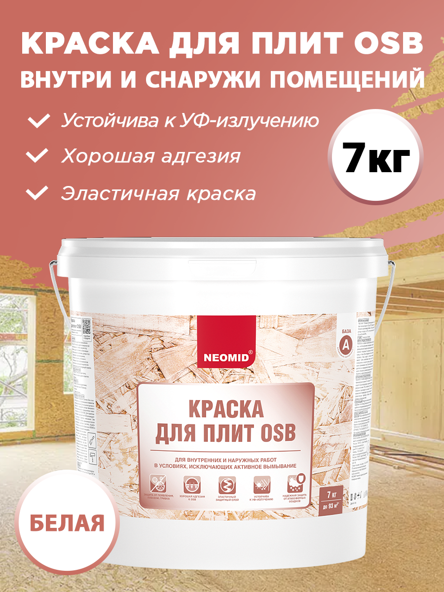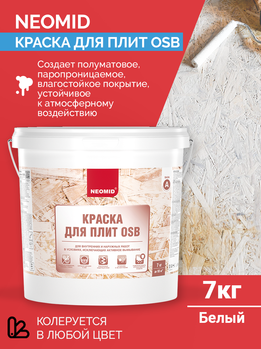 Краска для Плит OSB Neomid 7кг Белая, Полуматовая для Внутренних и Наружных Работ / Неомид.