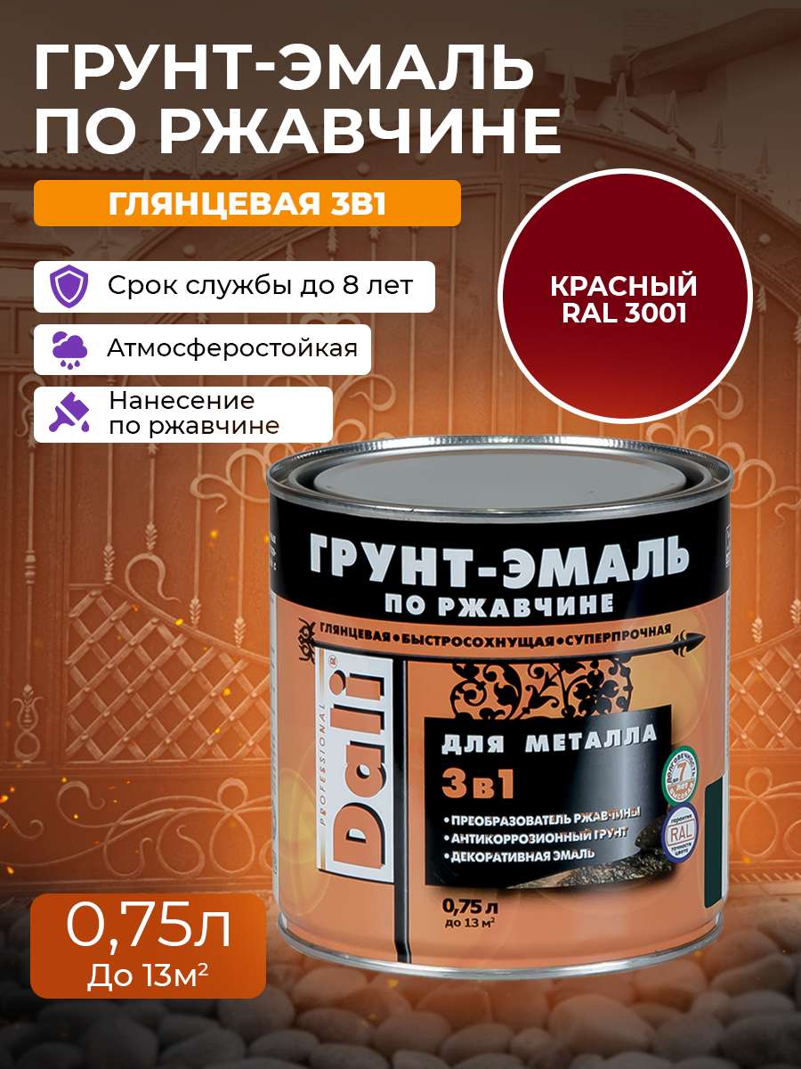 Dali Грунт-Эмаль по ржавчине 3в1 гладкая (Красный, RAL 3001, 0,75 л)