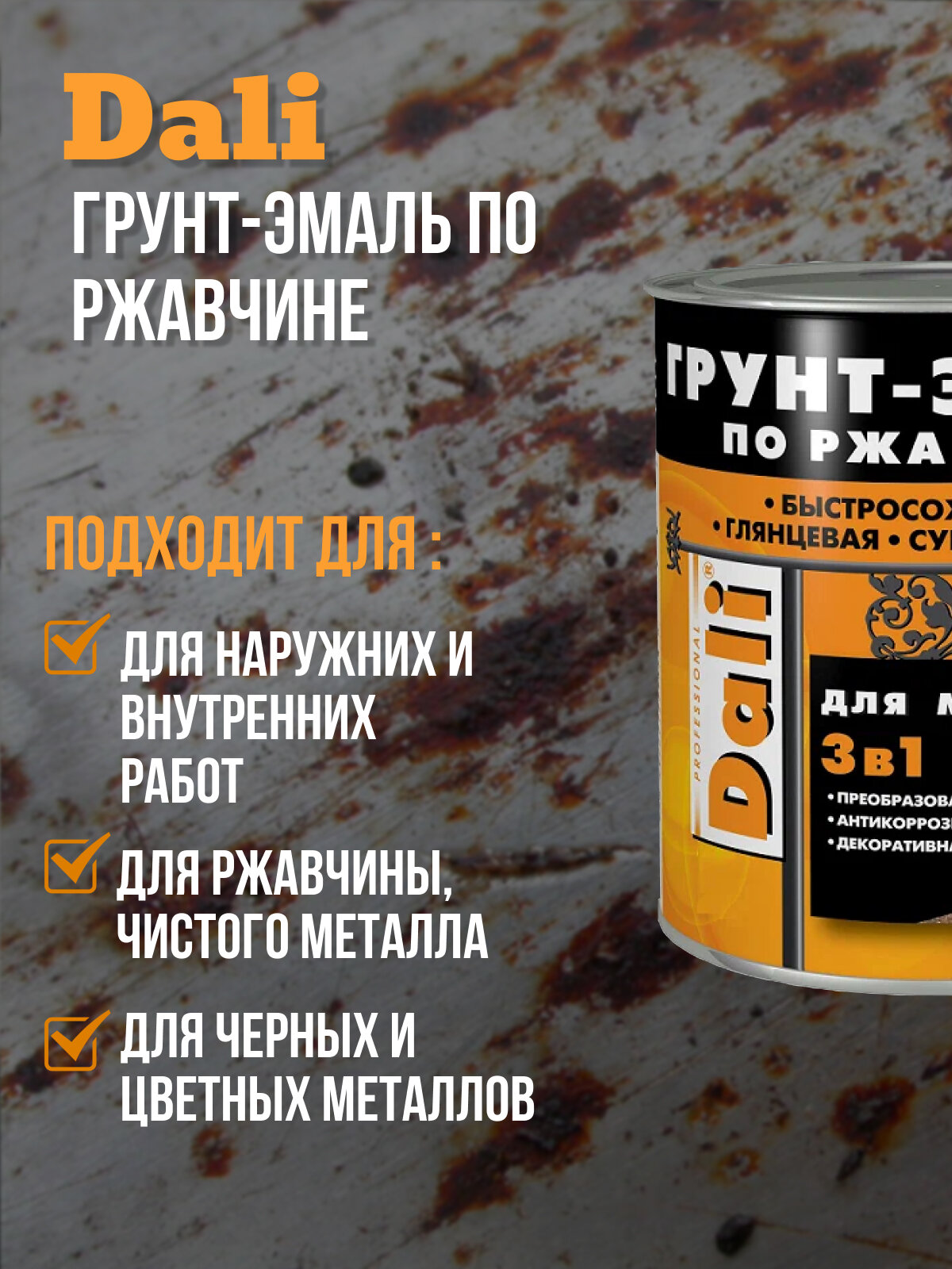 Dali Грунт-Эмаль по ржавчине 3в1 гладкая (Оранжевый, RAL 2004, 2 л)