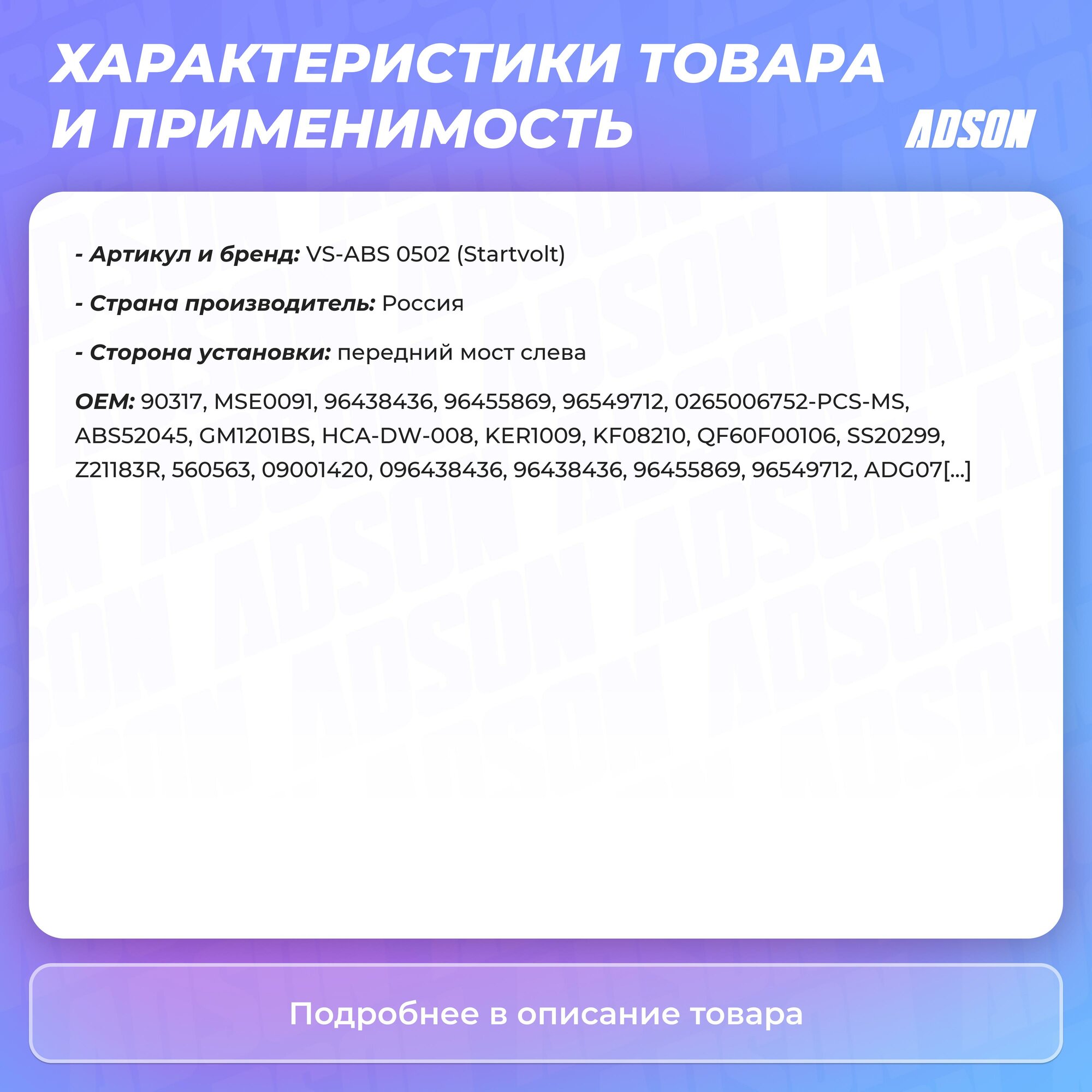 Датчик АБС передний левый STARTVOLT VS-ABS 0502 для Chevrolet Lacetti, Chevrolet Nubira, Daewoo Lacetti, Daewoo Nubira
