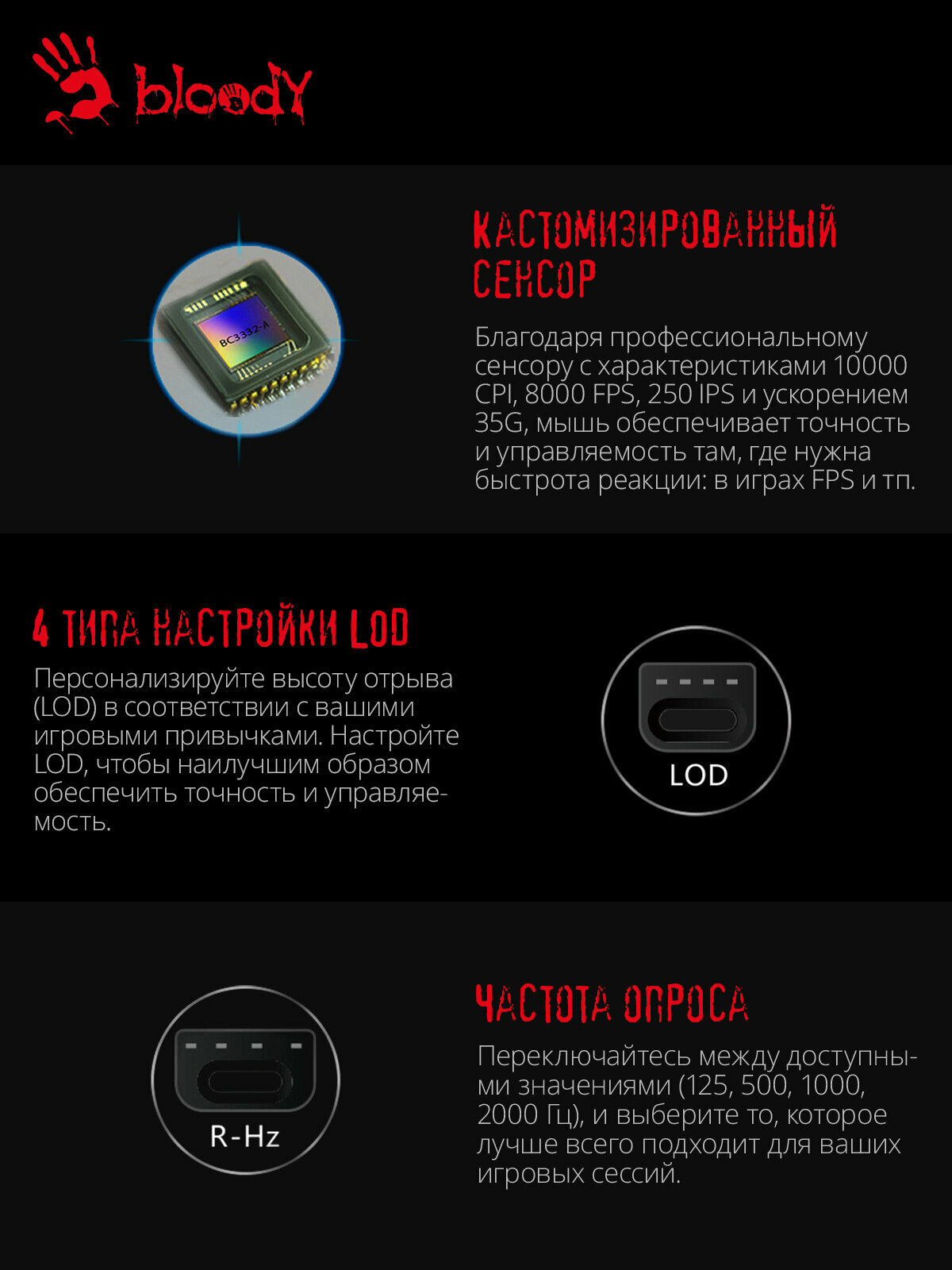 BC3332-A 10K - разогнали и по ощущениям он не хуже 3389 и младше. Я мучал эту мышь точно так же как PulseFire Surge, MS Explorer Pro, и каких либо негативных ощущений нет. Несомненным плюсом стало то, что А4tech начали добавлять физическую настройку без ПО в свои устройства и судя по всему уходить от аляповатого дизайна. Многие ругают глайды Bloody, но с точки зрения инженера мышь не должна терять в скорости при передвижении по поверхности. Да кому то не хватает контроля в эти моменты, но это зависит только от вас, все дело в привыкании. На хорошем тефлоне мышки летают так же. Но тефлон к которому все привыкли стирается, царапается, а эти глайды нет. Конечно есть недочеты в качестве сборки, хрусты и небольшие бряканья. Щели, через которую видна подцветка .Но на игру это ни как не влияет. Колесо хотелось бы более объёмное, с отсечками по четче. Кабель неплохой, гибкий и в оплетке, вывод кабеля задран над поверхностью. Не пушинка, просто хороший. Мышь для правши, несмотря на некоторую резкость в линиях, мышь хорошо сидит в руке и рука не устает. Хват ладонный. Если хочется RGB, точности и вполне адекватной цены - эта мышь идеальный вариант несмотря что это Bloody. Софт я описывать не буду, Bloody вам пора вырасти хоть чуть-чуть. Если хочется чего то более серьезного но за разумные деньги - Bloody X5 Pro (3389) |