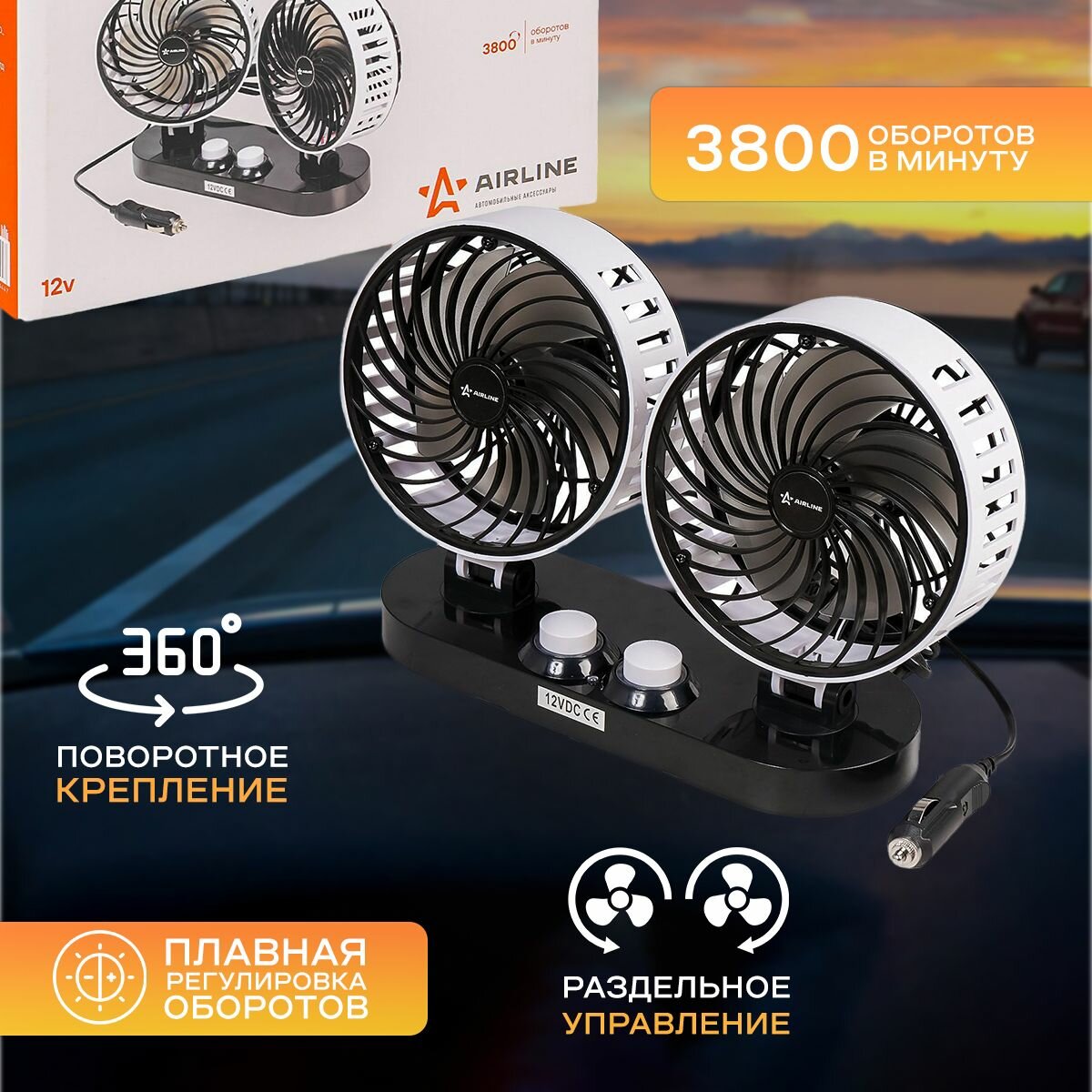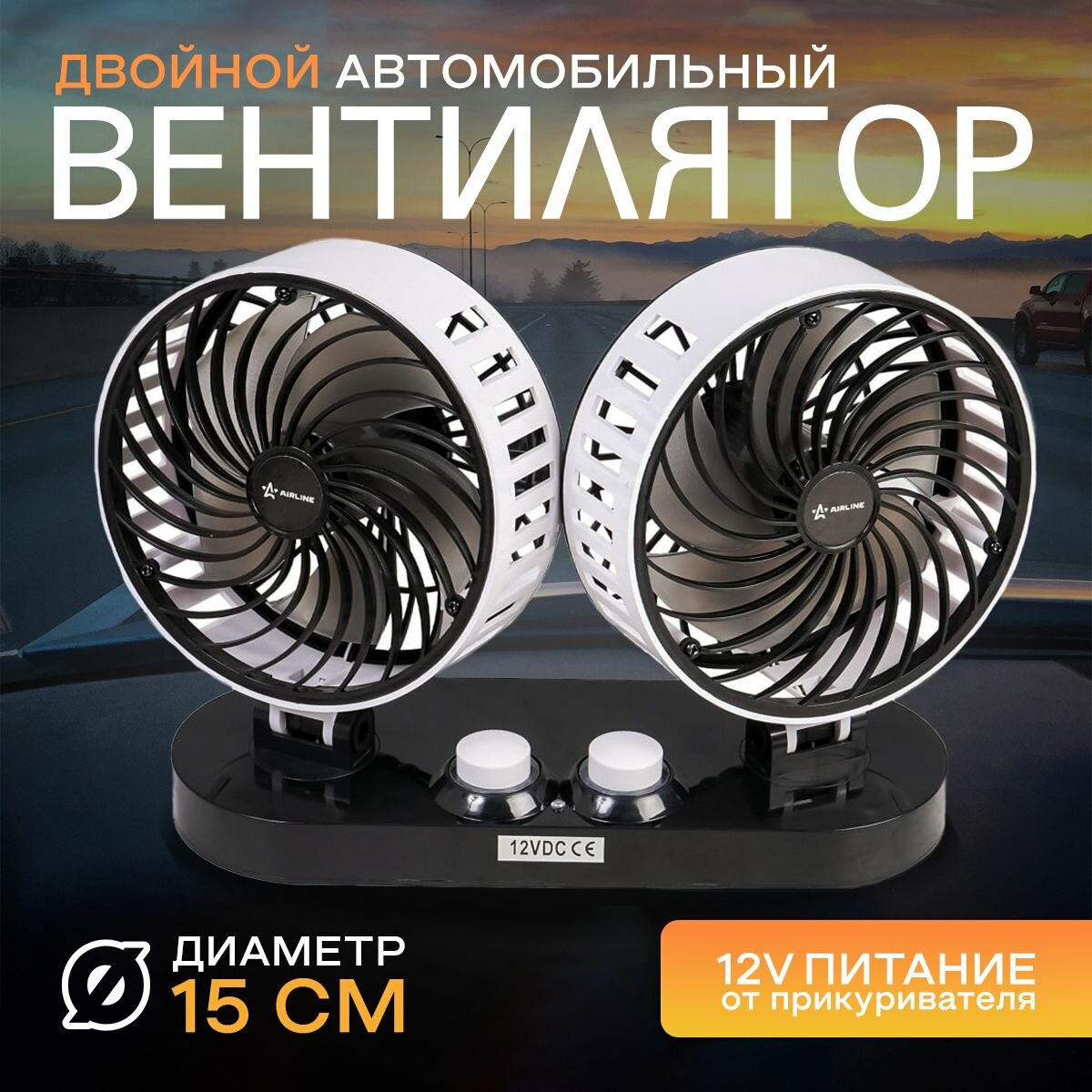 AIRLINE ACF-12-06 Вентилятор в салон двойной 2х15см 12В раздельная регулировка пластик (ACF-12-06)