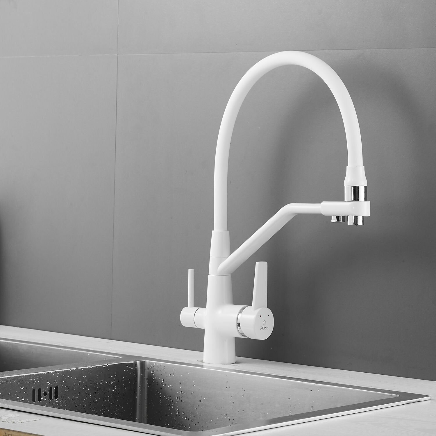 Смеситель для кухни с гибким изливом и фильтром для воды Rose R558C, белый