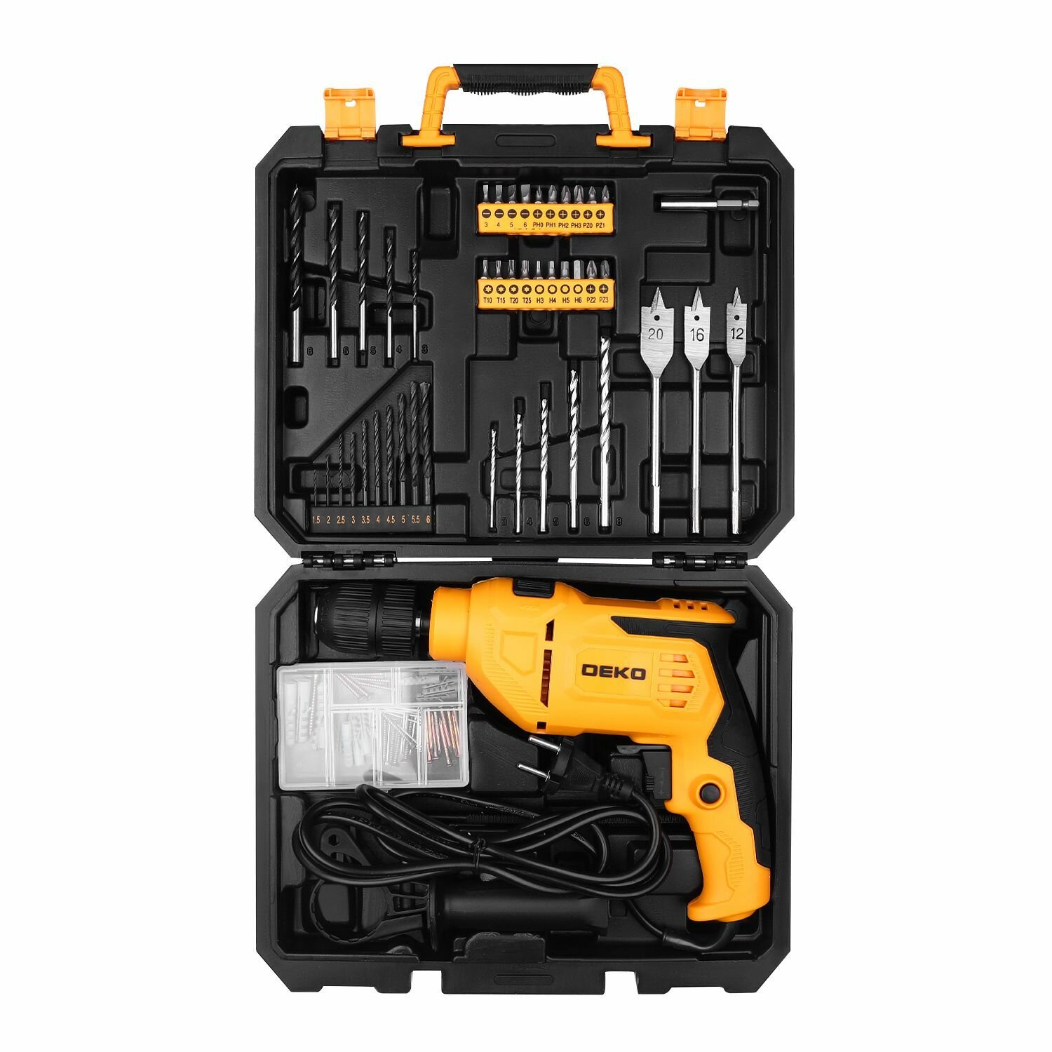 Дрель ударная сетевая Deko DKID600W в пластиковом кейсе набор инструментов 92 предмета черно-желтый
