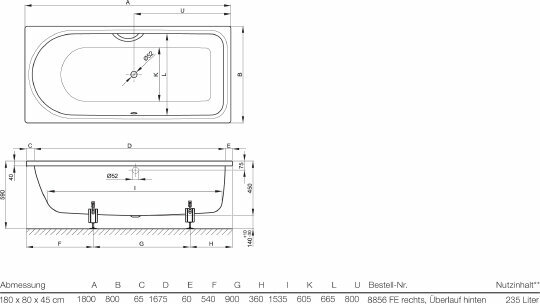 Ванна встравиваемая BETTE BETTEOCEAN 8856-000 PLUS, без ножек и слив перелива, 180 см