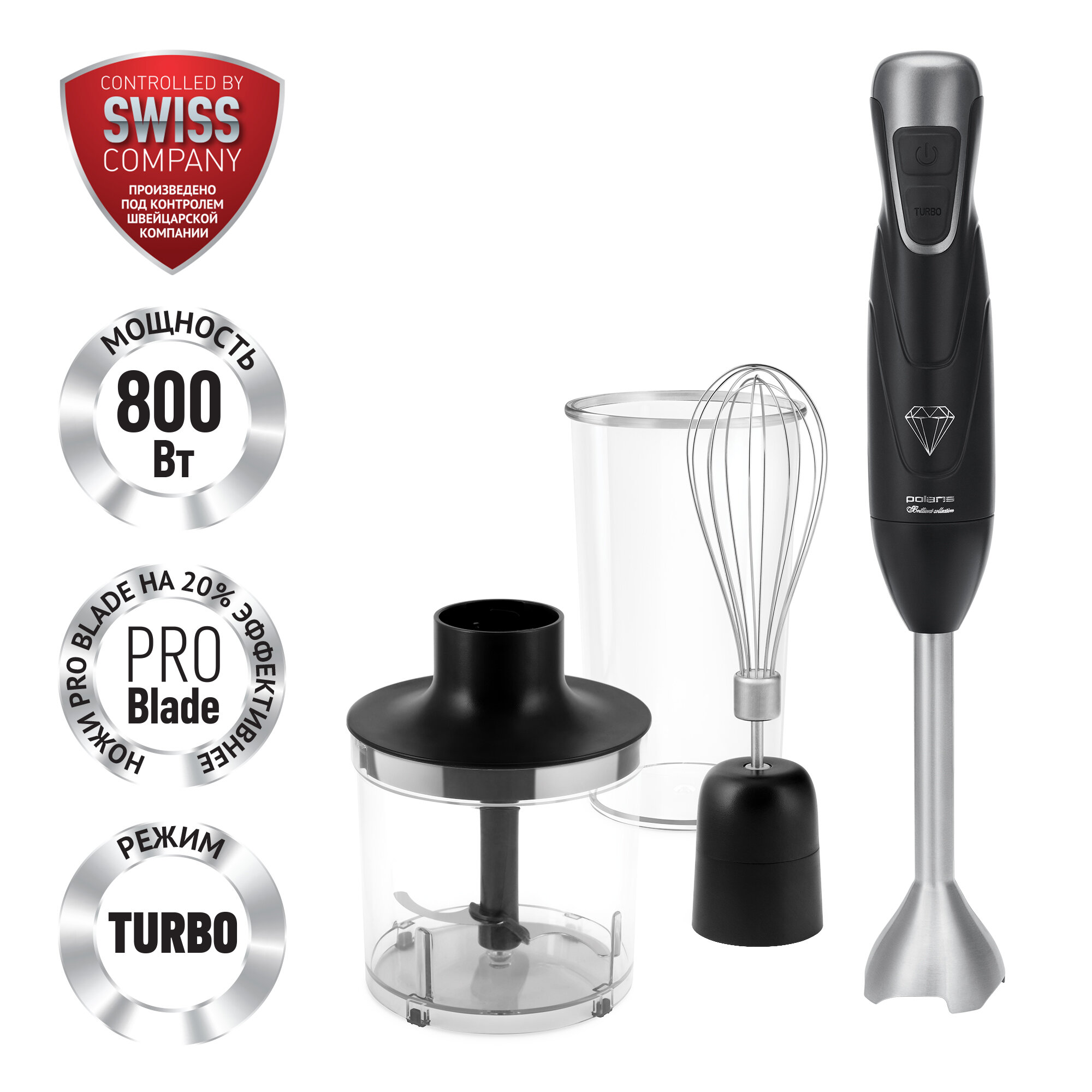 Купить Блендер погружной POLARIS PHB 0848, 800Вт, 2 режима, измельчитель, венчик, стакан, черный