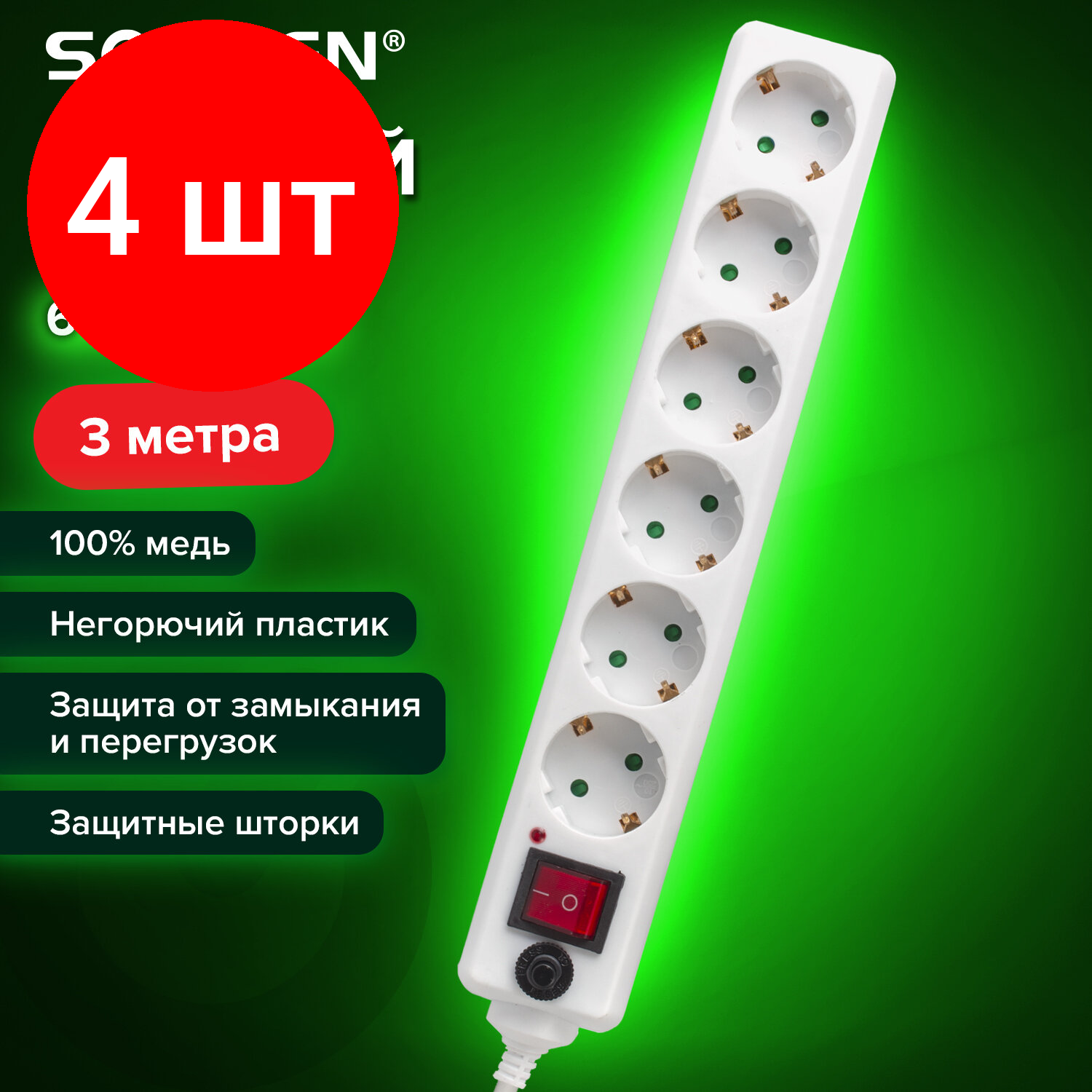 Купить Комплект 4 шт, Сетевой фильтр SONNEN U-363, 6 розеток, с заземлением, выключатель, 10 А, 3 м, белый, 511426
