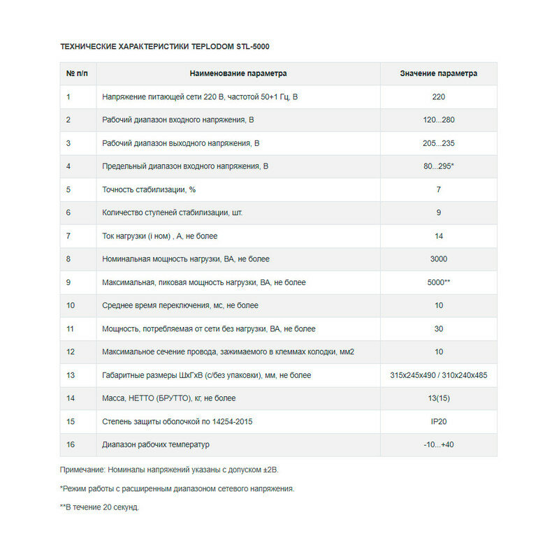 Стабилизатор напряжения Teplodom STL-5000 белый/черный 5000 ВА 3000 Вт 270 мм 195 мм 450 мм 13 кг