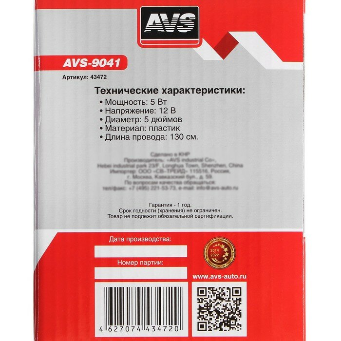 Вентилятор автомобильный 12В 5" AVS Сomfort 9041