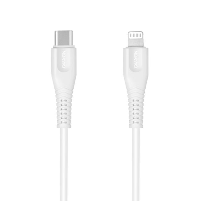 Кабель для зарядки CANYON и передачи данных USB Type-C - Lightning (лицензия Apple), MFI-4, 1.м., 3.5 мм. 5V/2.4A., PD 18Вт, белый