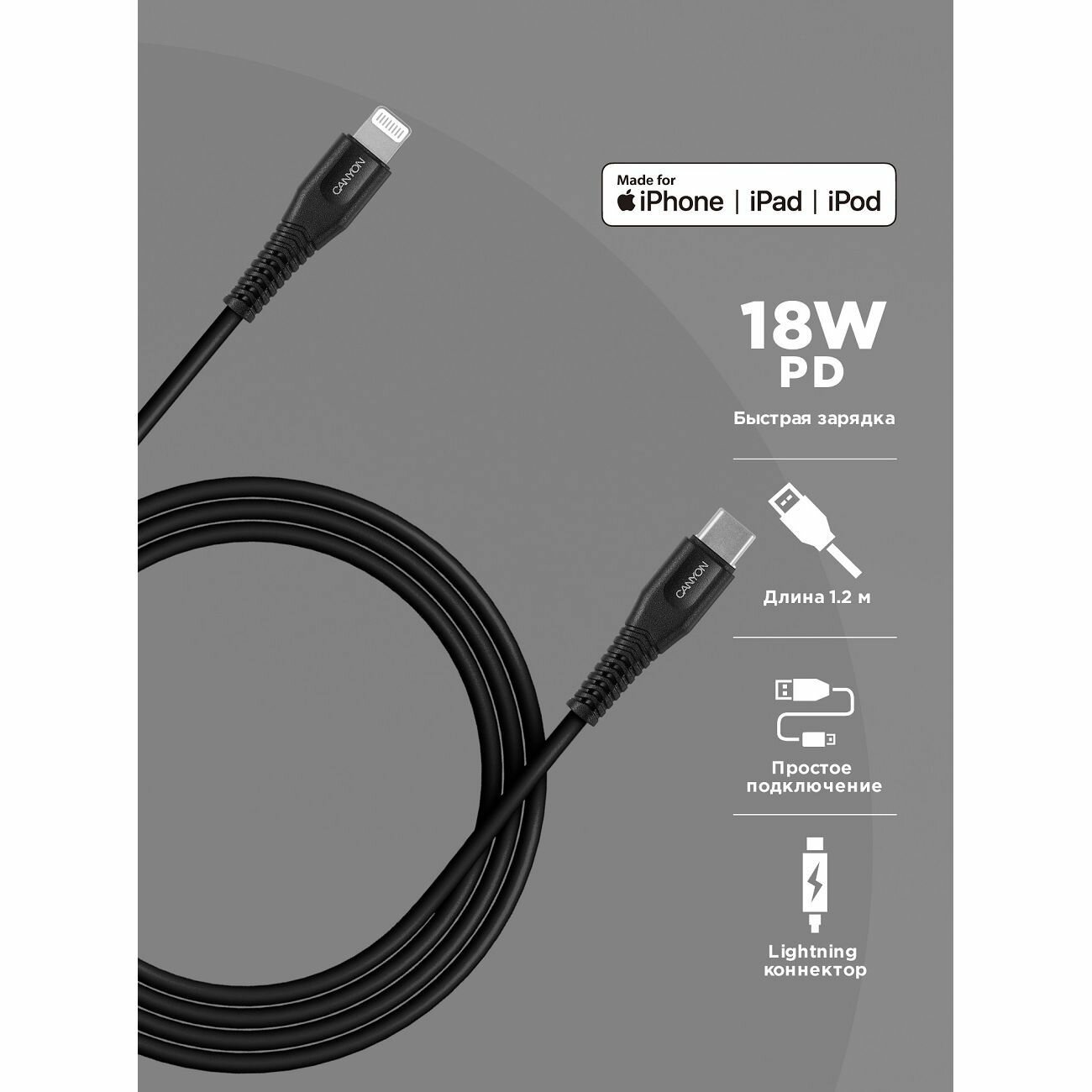 Кабель для зарядки CANYON и передачи данных USB Type-C - Lightning (лицензия Apple), MFI-4, 1.м., 3.5 мм. 5V/2.4A., PD 18Вт, черный