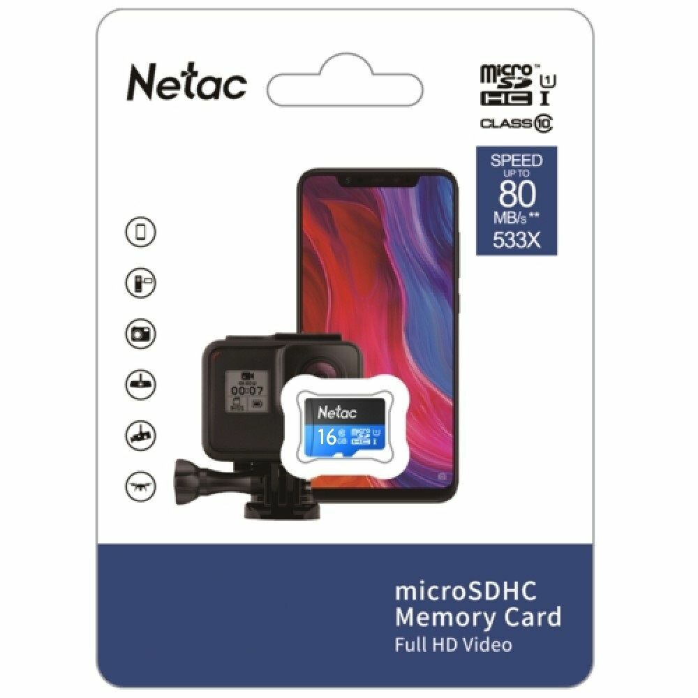 Карта памяти microSDHC UHS-I U1 NETAC P500 16 ГБ, 80 МБ/с, Class 10, NT02P500STN-016G-R, 1 шт., пер