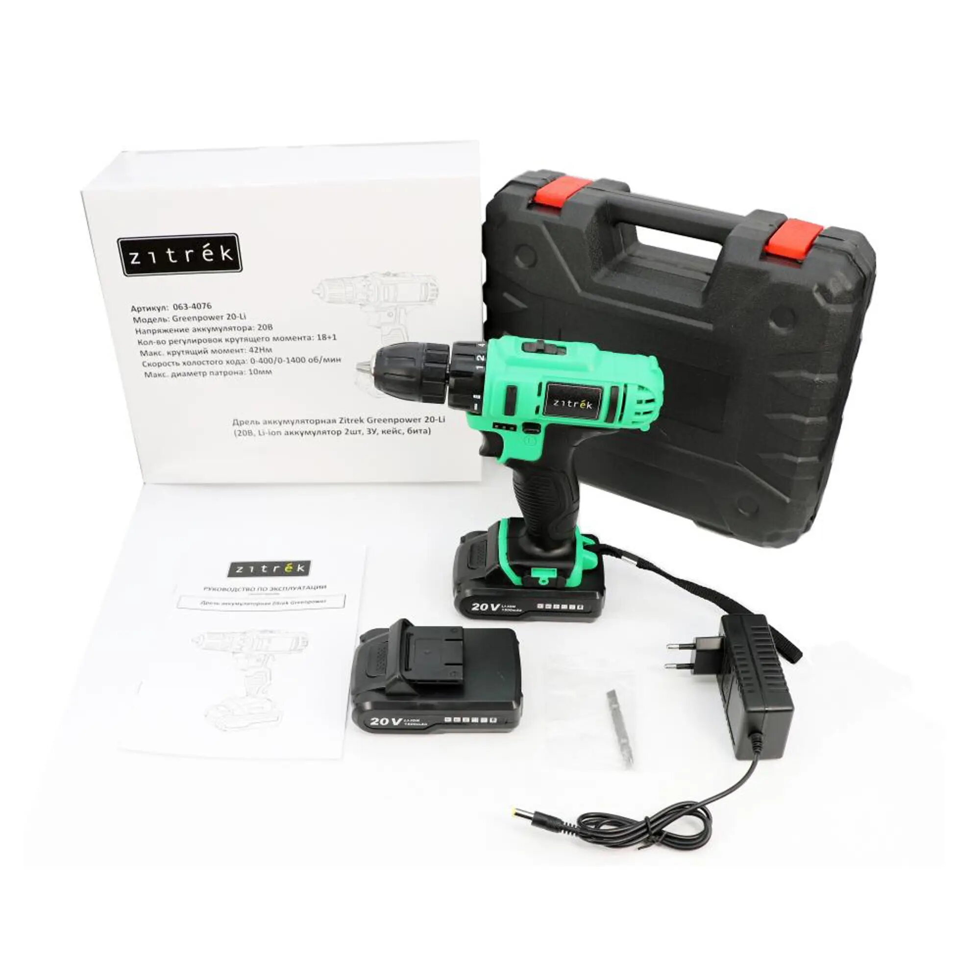 ZITREK Greenpower 20-Li (20В, Li-ion аккумулятор 2шт, ЗУ, кейс, бита) 063-4076 (Дрель-шуруповерт)