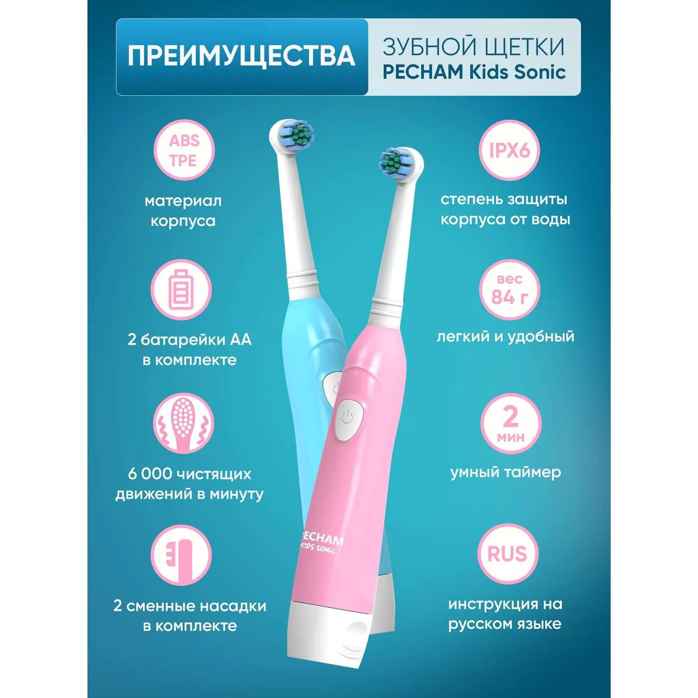 Детская электрическая зубная щетка PECHAM Kids Sonic Pink 5+, 2 насадки, 2 батарейки АА