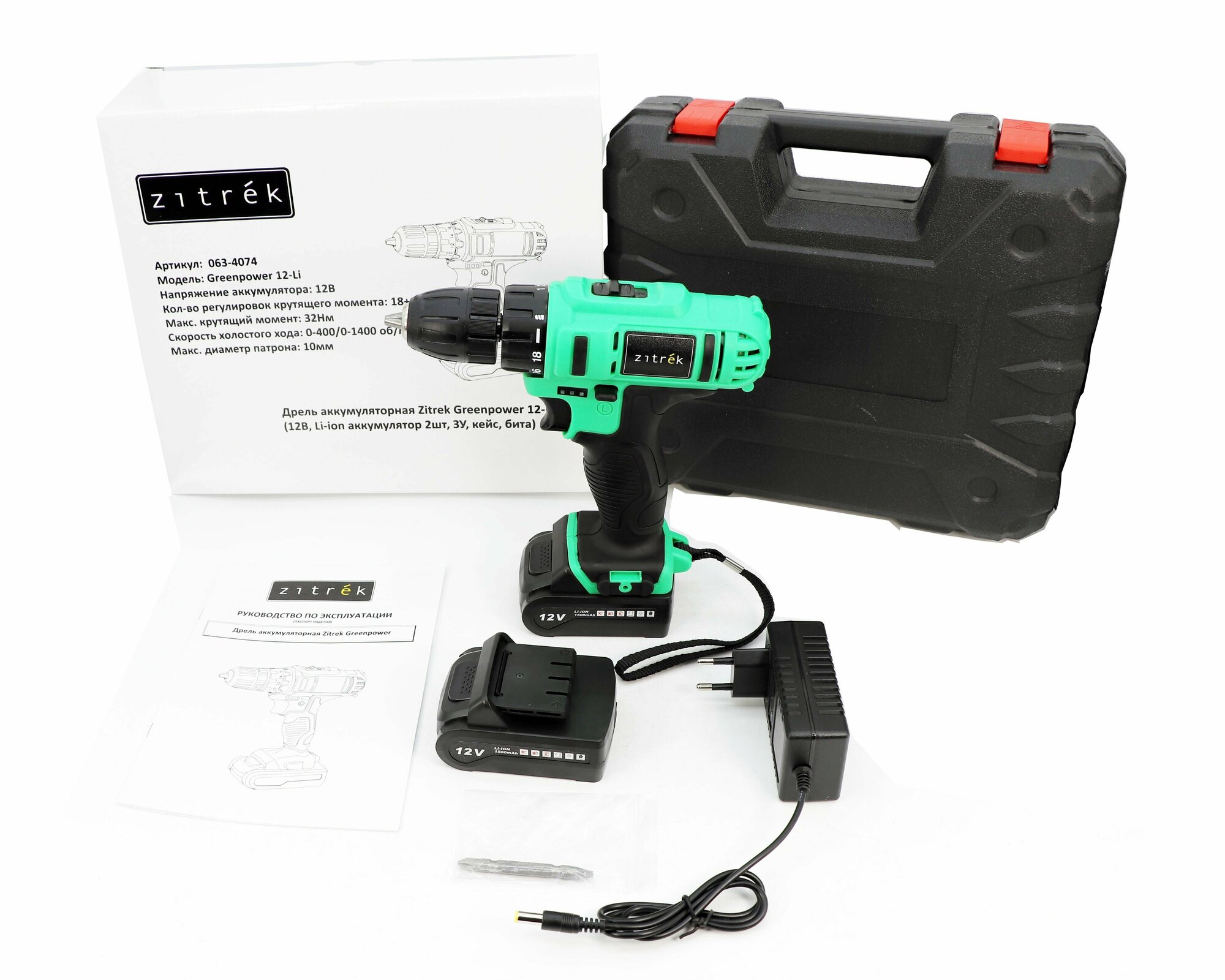 Дрель аккумуляторная Zitrek Greenpower 12-Li (12В, Li-ion аккумулятор 2шт, ЗУ, кейс, бита) 063-4074