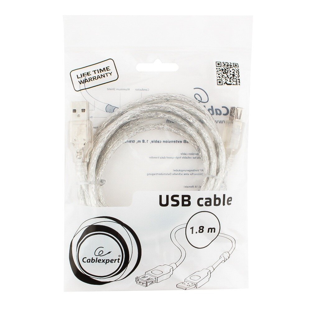Gembird Cablexpert Кабель удлинитель USB2.0 Pro, AM AF, 1,8м, экран, 2 феррит.кольца, прозрачный CCF-USB2-AMAF-TR-6